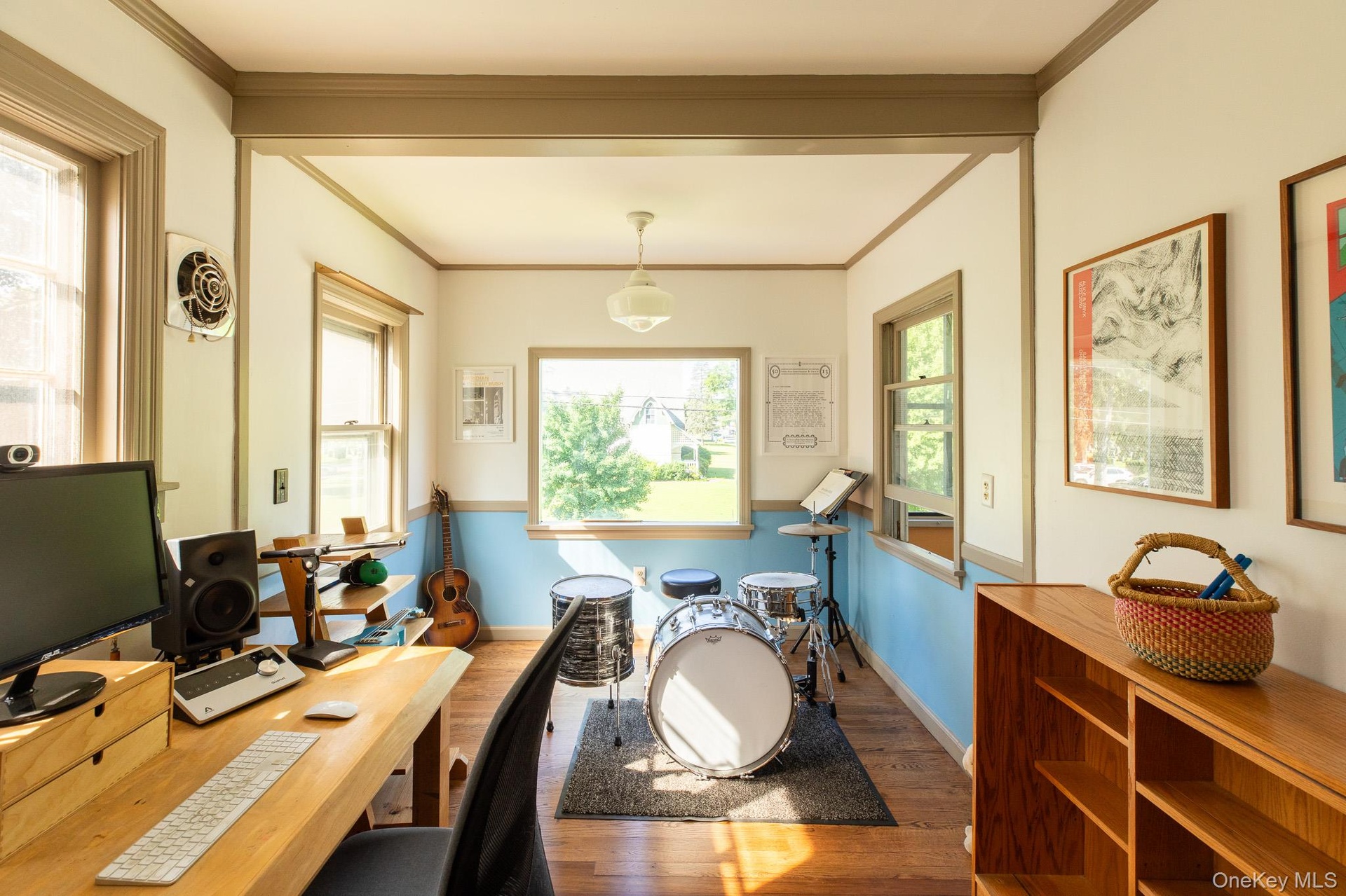 - Office area with wood finished floors and crown molding