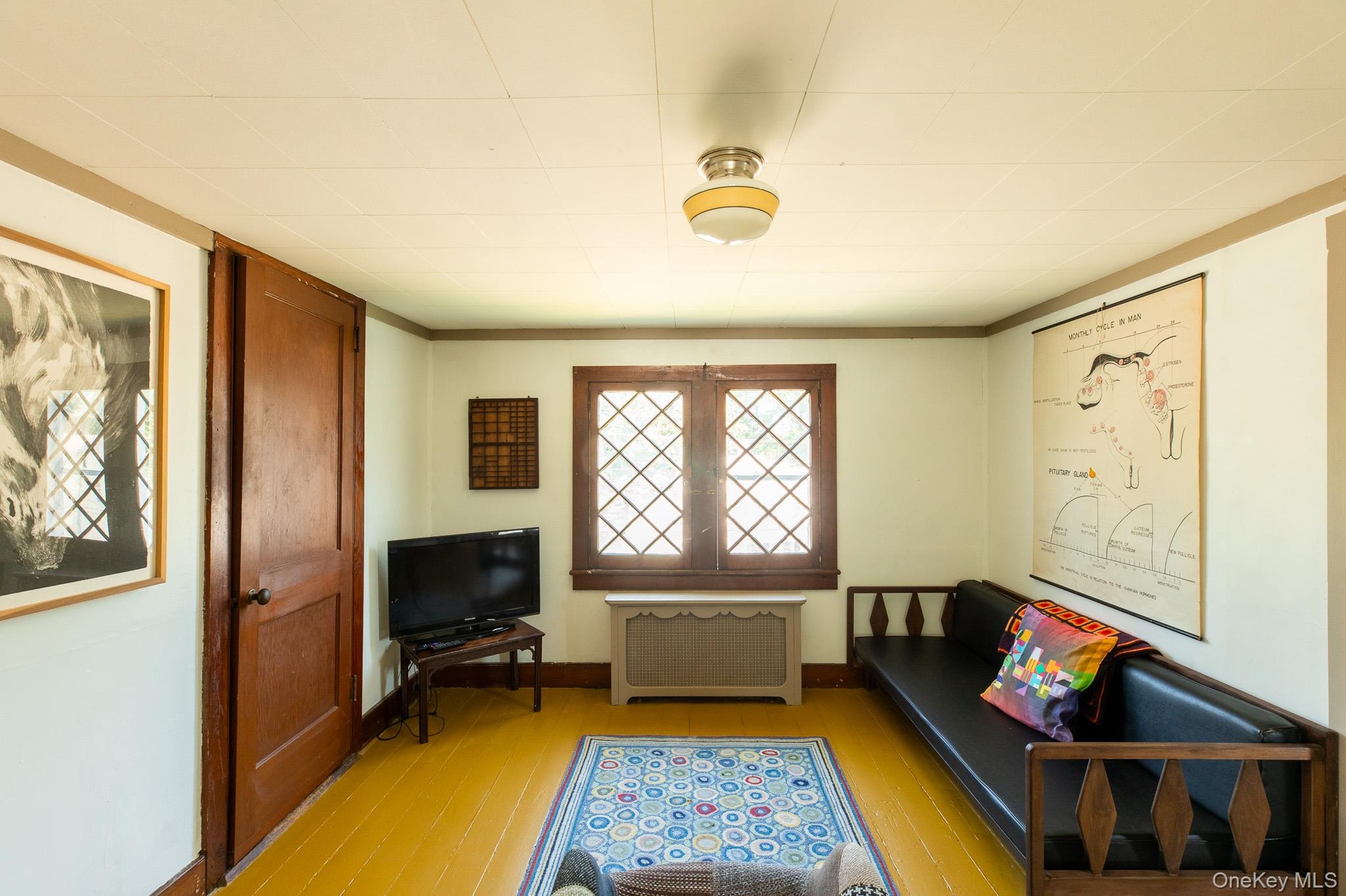 - Sunroom with radiator heating unit and a chandelier