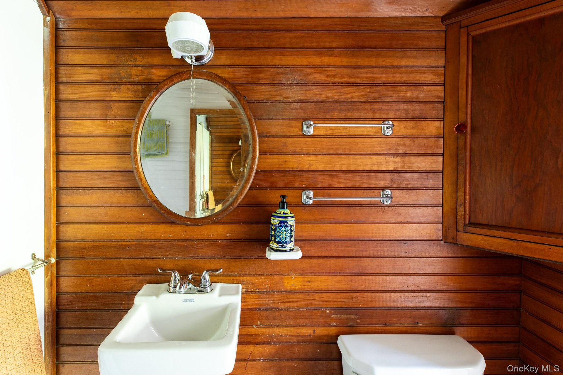 - Bathroom featuring a sink and wooden walls