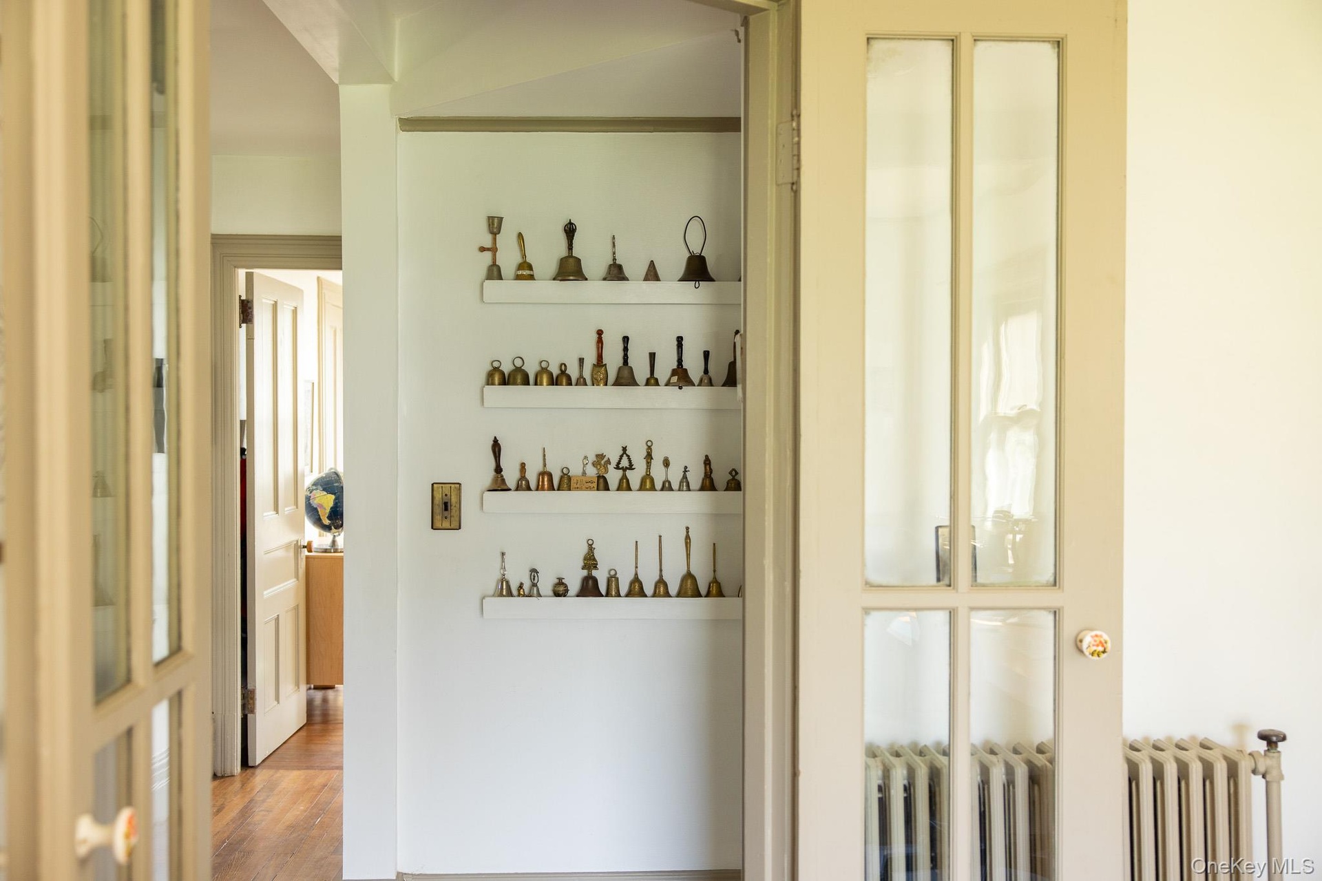 - Detailed view of radiator heating unit and wood finished floors