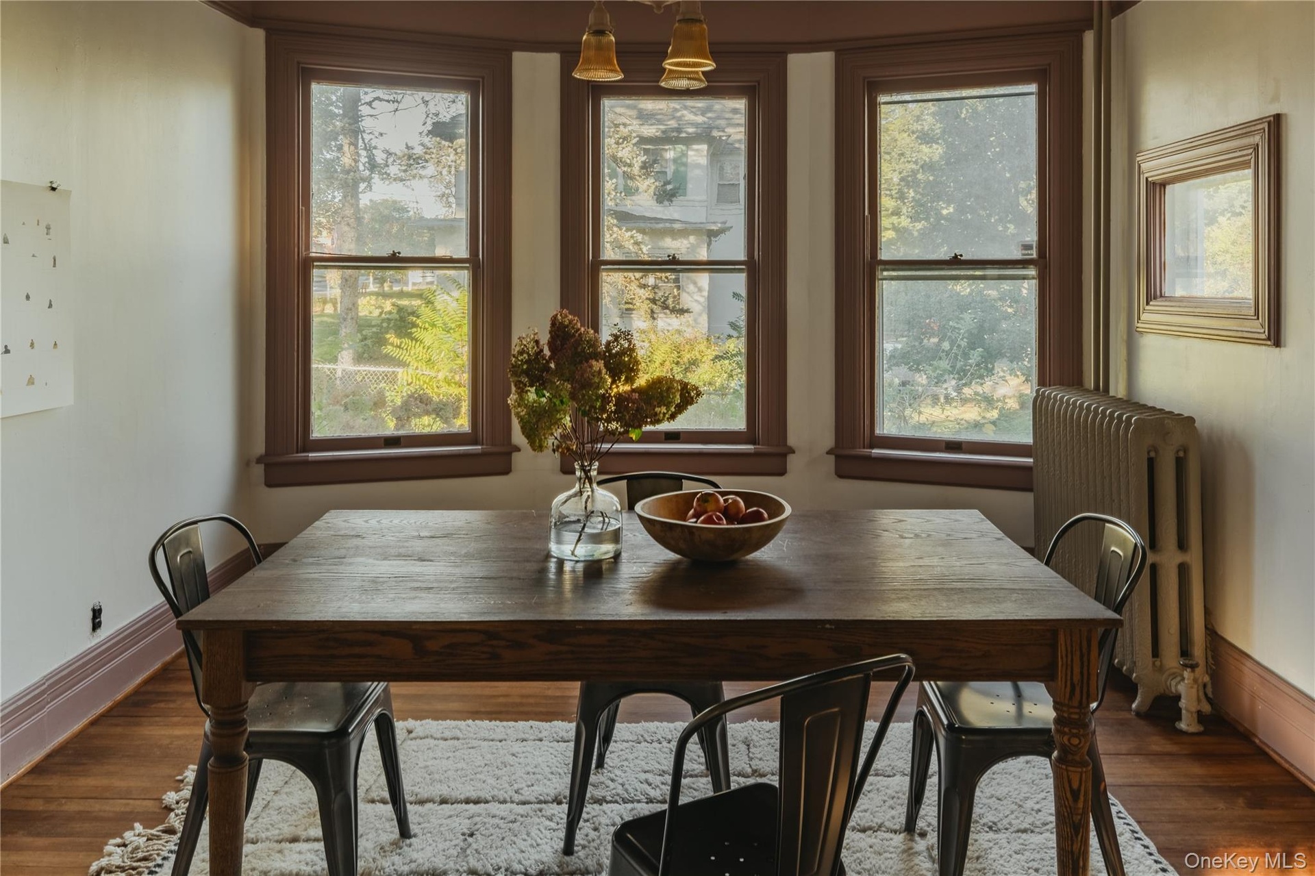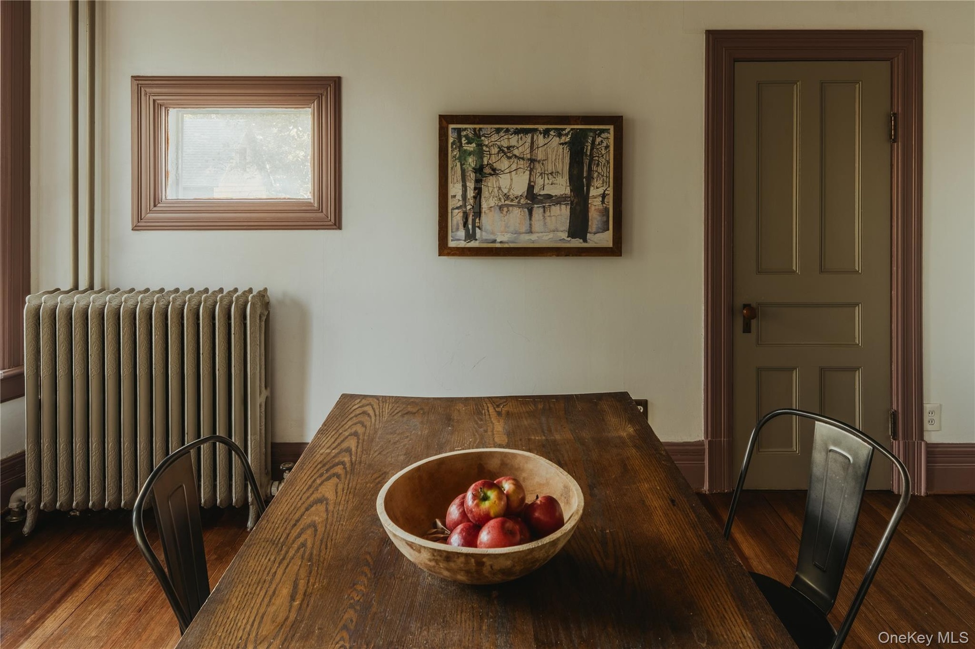 - Dining space featuring radiator and wood finished floors