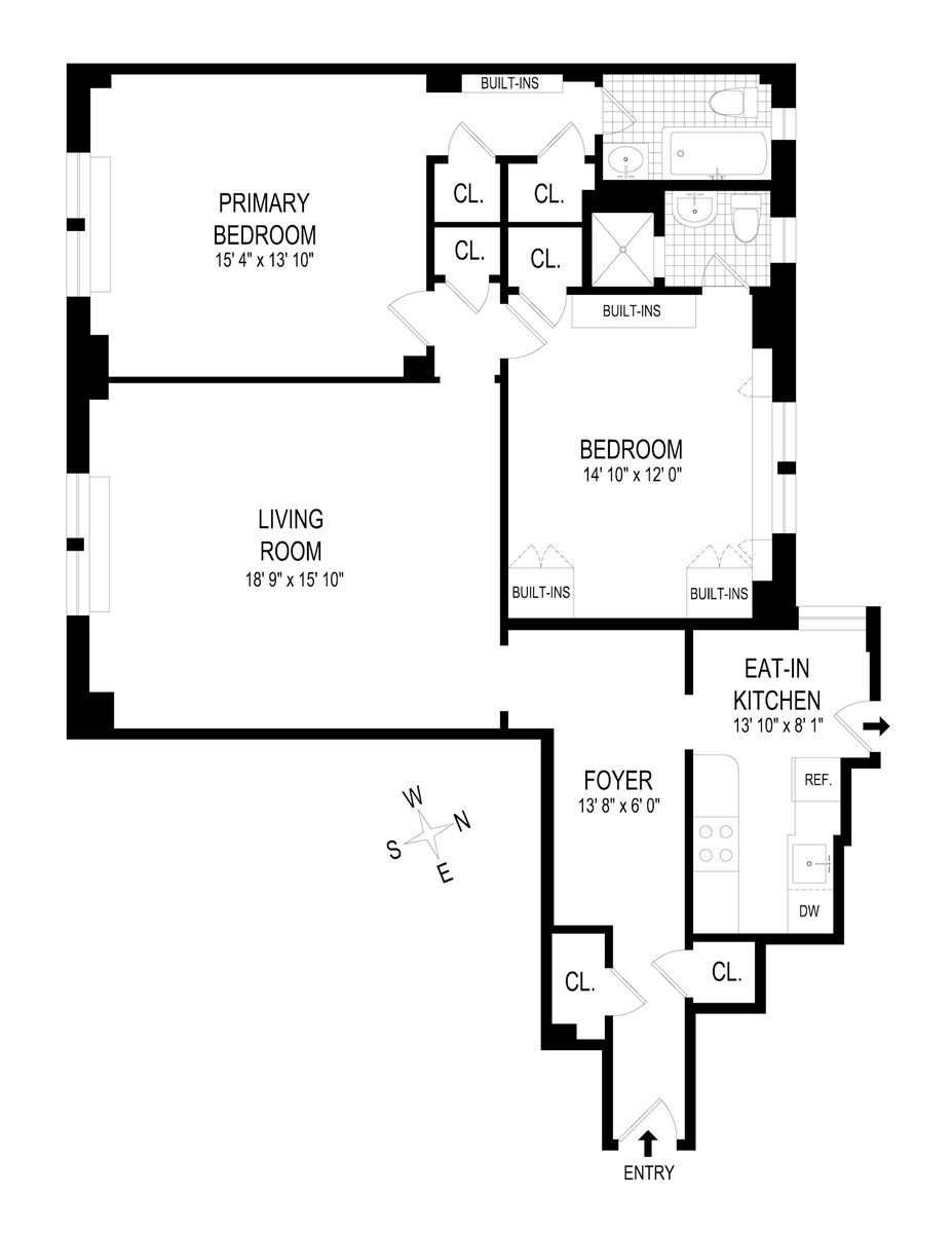 DescriptionThis is a special, rarely-available two-bedroom, two-bath apartment in the C line of Beekman Hill House located in the prestigious Beekman Hill neighborhood. A large foyer with two closets welcomes you into the apartment. A windowed eat-in kitchen is to your right at the end of the foyer. The living room, to the left, is large and spacious with tree-top views from the windows. The primary bedroom is large and spacious, with ample room for furniture and a reading chair. It also has the lovely tree-top views. Adjacent to the bedroom, there is a dressing area with built-ins and two closets leading to the windowed en suite bath. The study/second bedroom is fitted with book shelves and built-ins with room for a pull-out couch or Murphy bed. The windowed bath is en suite with a shower. There are high-beamed ceilings in the apartment, the floors are oak with cherry borders and there are other pre-war details in the apartment as well. The second floor location makes it easily accessible at all times by elevator or a short flight of stairs.