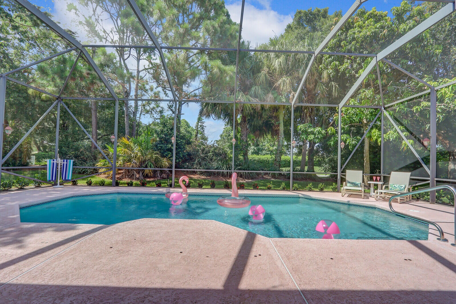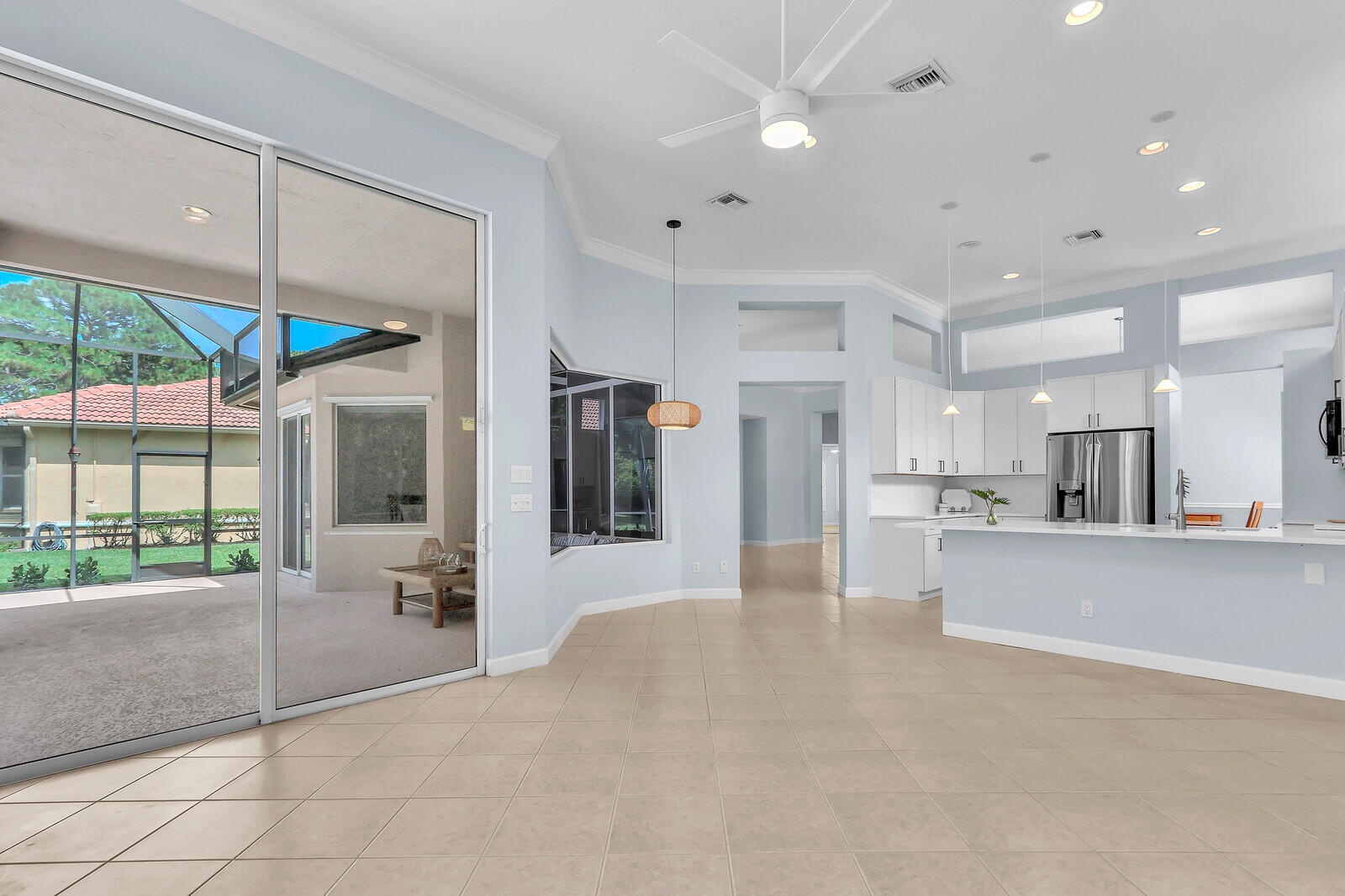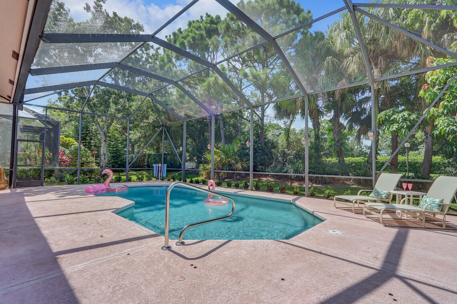 Beautiful, UPDATED 2BR with DEN home in the desirable Greenbrier neighborhood of PGA Village! This move-in-ready home features a light-filled kitchen with white cabinetry, sleek SS appliances, & stunning quartz countertops accented by a stylish tile backsplash. A breakfast bar opens seamlessly into the spacious family room--perfect for casual gatherings. Entertain effortlessly in the expansive living & dining areas, or step out to the large, screened lanai that overlooks a sparkling pool, ideal for outdoor relaxation & hosting guests. The generous primary suite offers ultimate comfort with two walk-in closets featuring custom built-ins & plush new carpeting. The luxurious ensuite bath boasts white cabinetry, new quartz countertops, & a fresh elegant design. Split floor plan ensures privacy