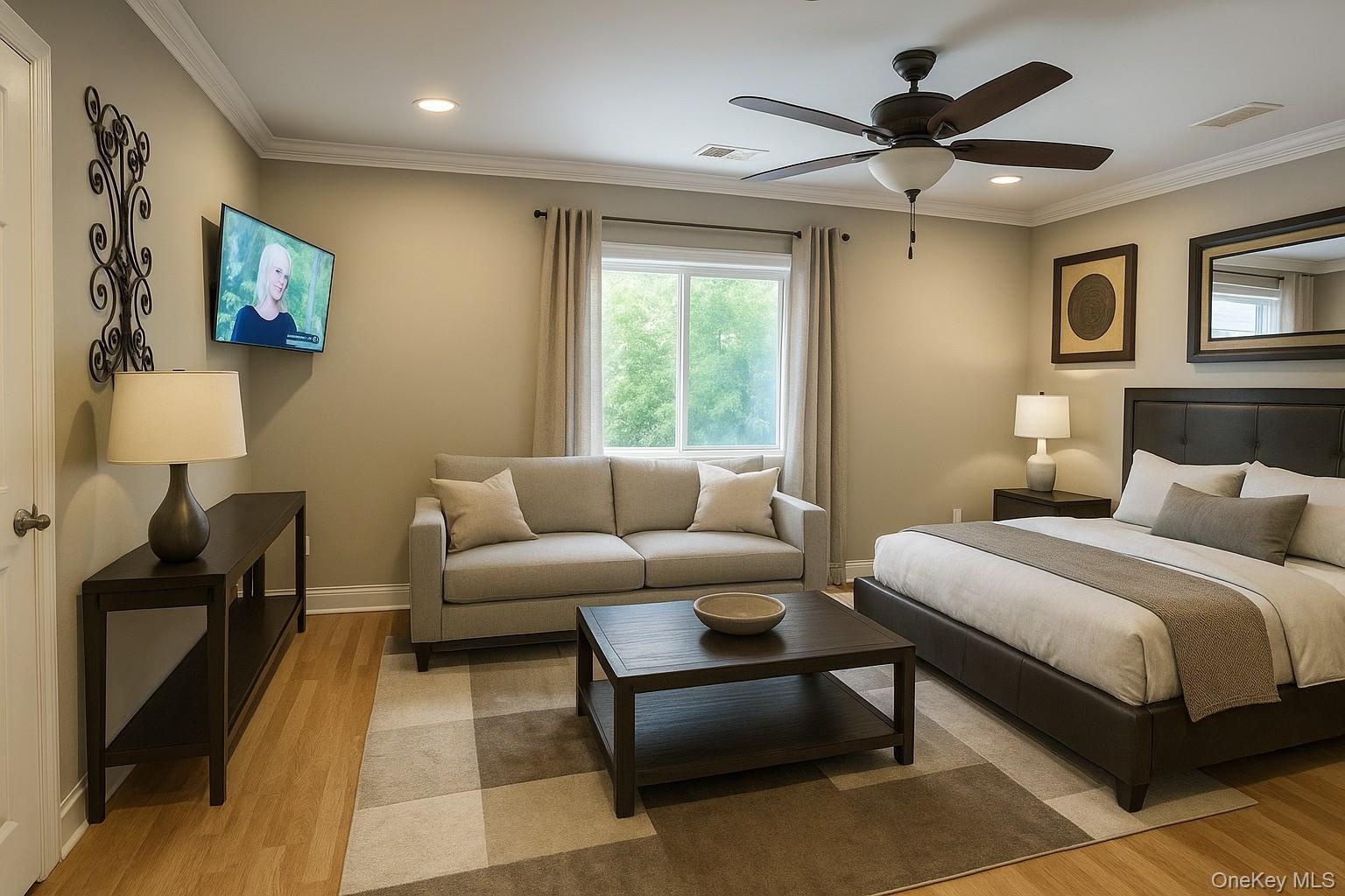 - Bedroom with light wood-style floors, ornamental molding, a ceiling fan, and recessed lighting