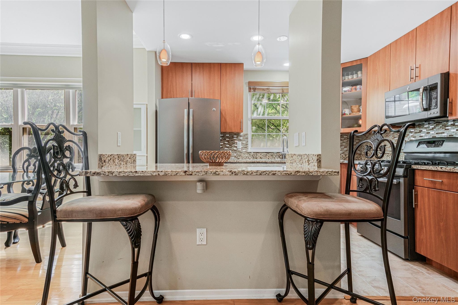 - Kitchen featuring appliances with stainless steel finishes, a breakfast bar area, light stone countertops, and recessed lighting
