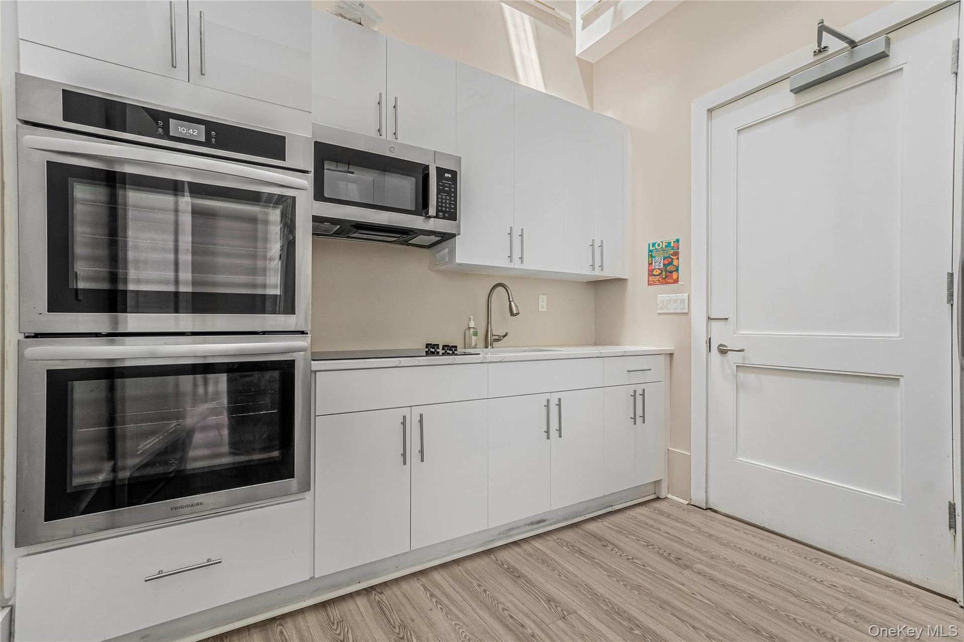 - Kitchen with appliances with stainless steel finishes, light wood finished floors, white cabinetry, and light countertops