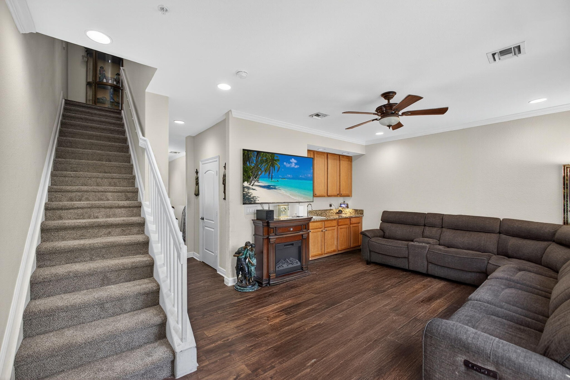 In the heart of Lake Worth Beach, just 2.5 blocks from the Intracoastal, this 3-level townhome offers a spacious, 1,727 sq ft floor plan & several recent upgrades. The Pergo Chester Ridge Hickory laminated flooring on all levels is less than 3 years old. One full bedroom & full bath are on the ground level. High ceilings throughout. The carpeting is less than 2 months old. The main level features crown molding & a kitchen with 2024 KitchenAid appliance set & a Samsung convection oven. Dedicated laundry room off the kitchen with a 2024 W/D & cabinetry. Attached to the kitchen is a formal dining room. There is great natural light & the windows face out to the pool & downtown. The living room features a full wet bar & views of the palm trees in your front yard. 2-ton HVAC system is 2021 &
