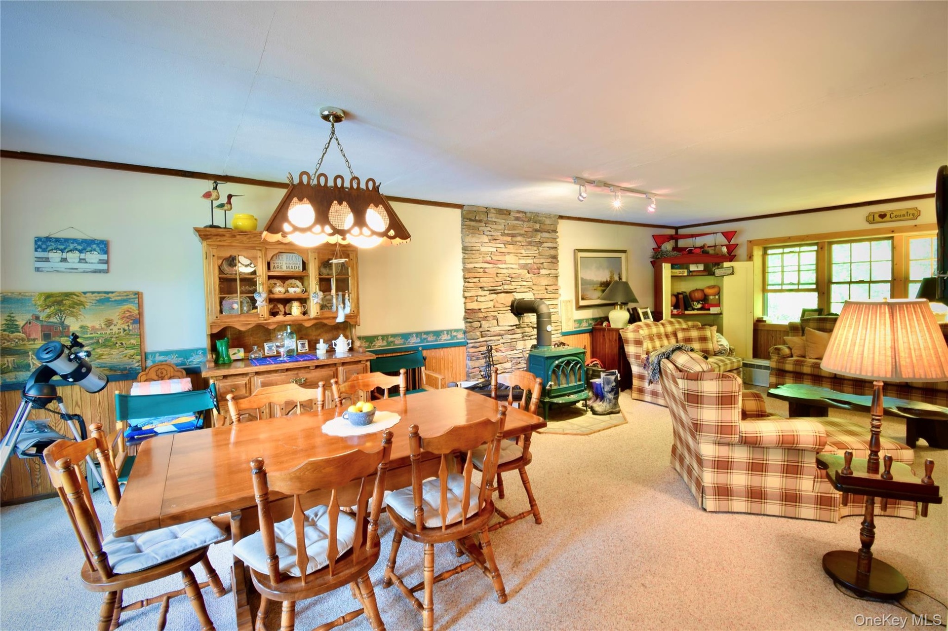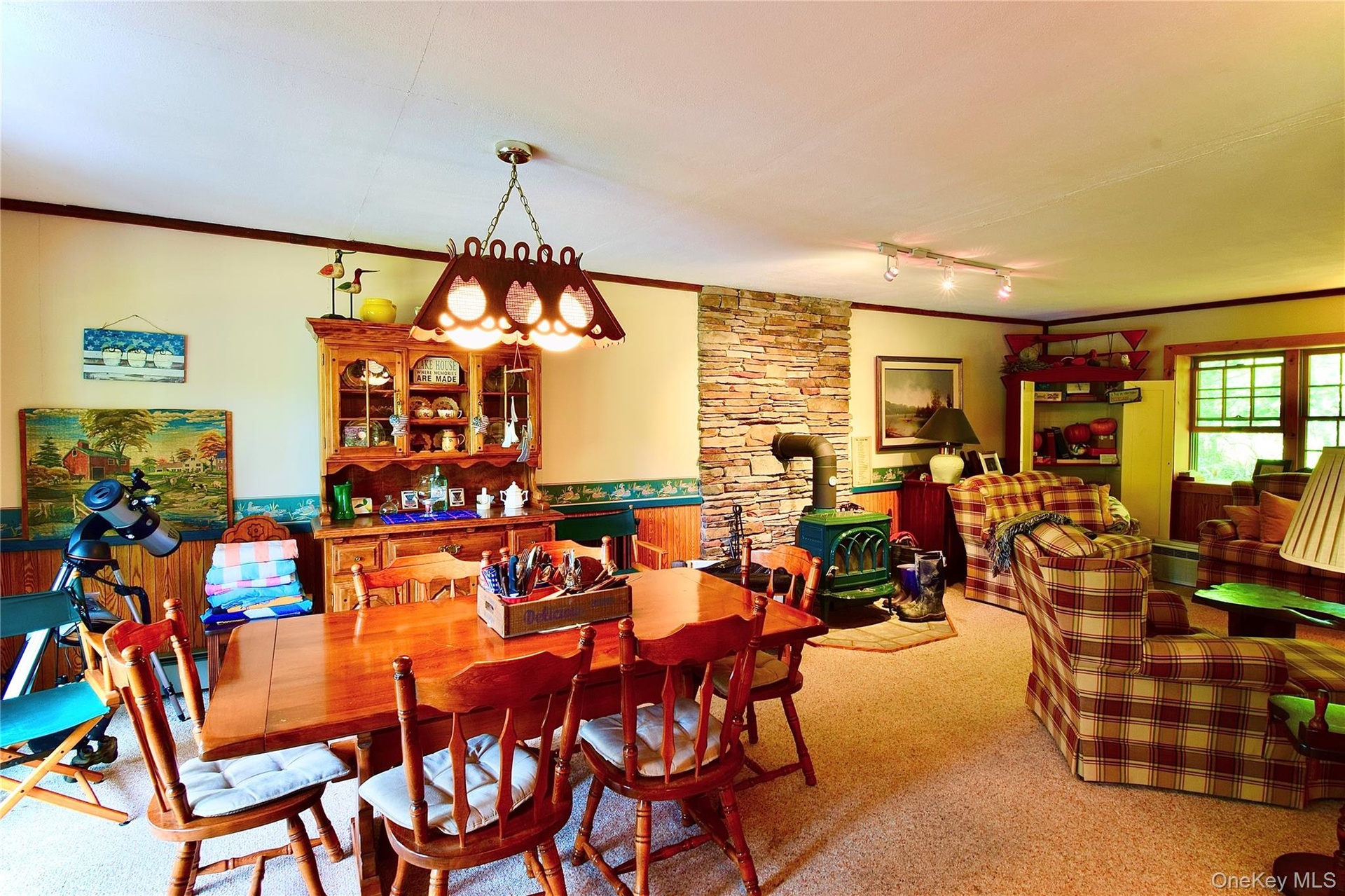 - Dining space featuring a wood stove, carpet, ornamental molding, and rail lighting
