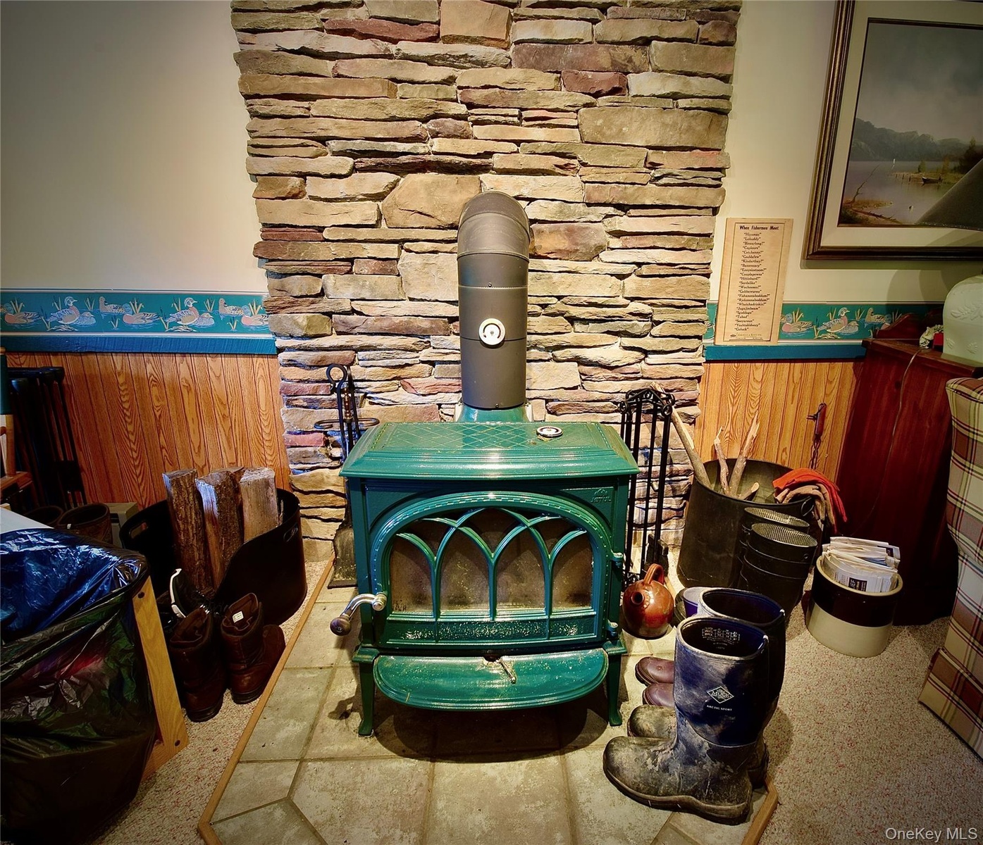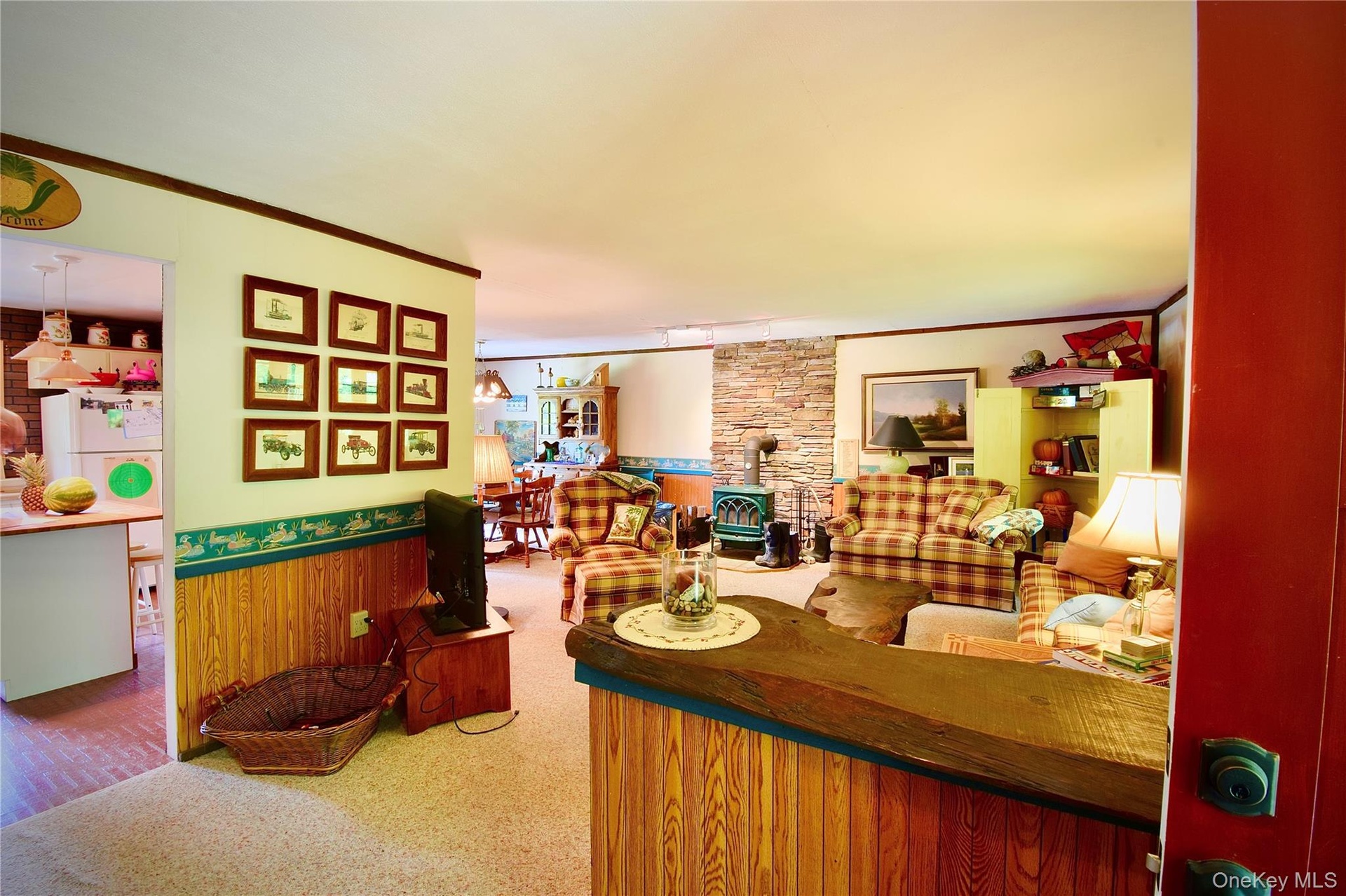 - Living area featuring carpet, a wood stove, ornamental molding, a wainscoted wall, and wood walls