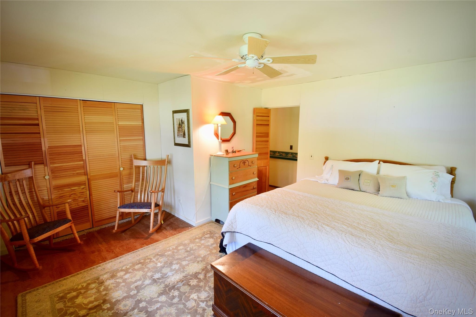 - Bedroom with a closet, wood finished floors, and ceiling fan
