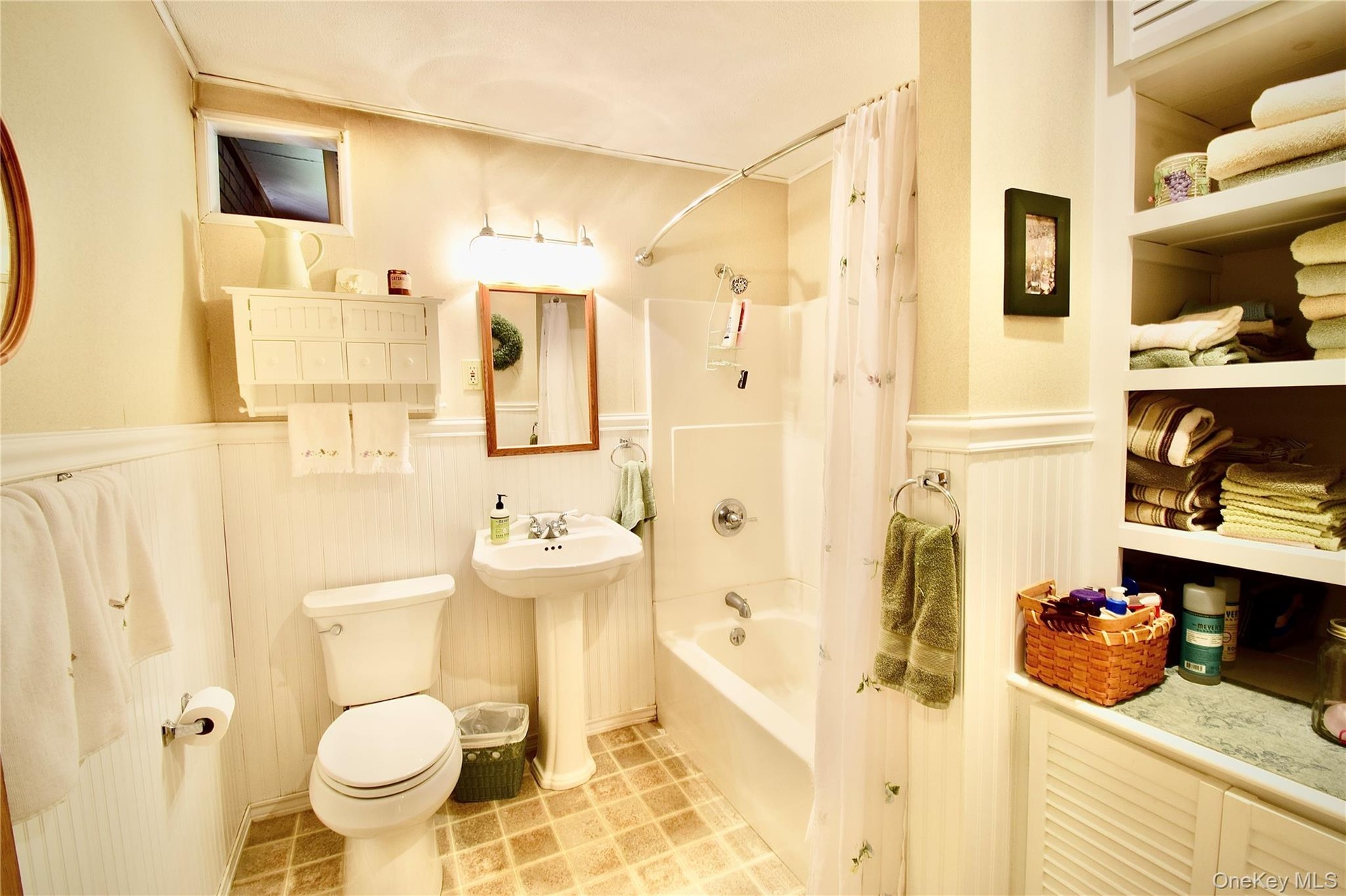 - Bathroom featuring wainscoting, shower / tub combo, and a decorative wall