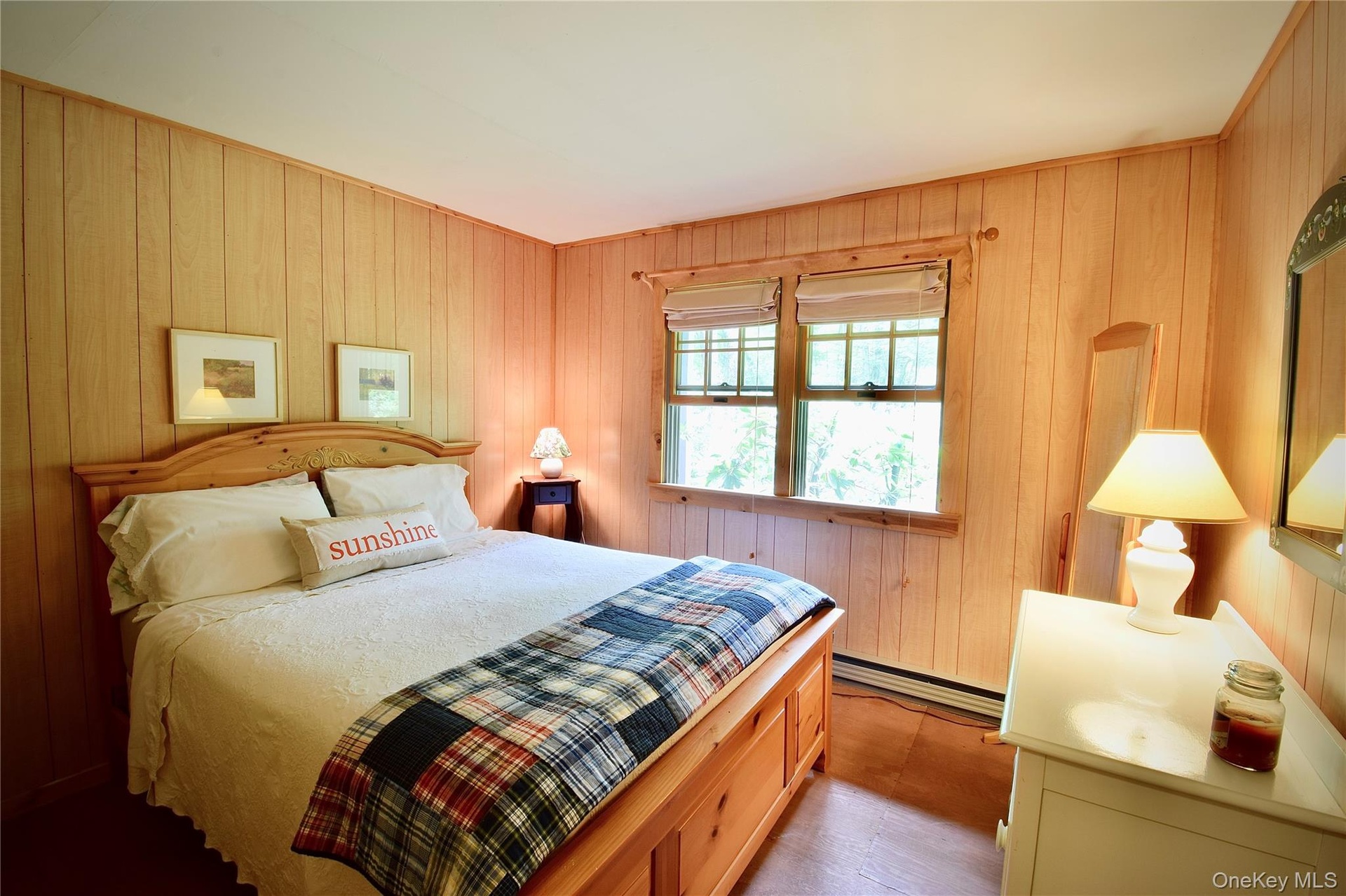 - Bedroom with wood walls, wood finished floors, and a baseboard heating unit
