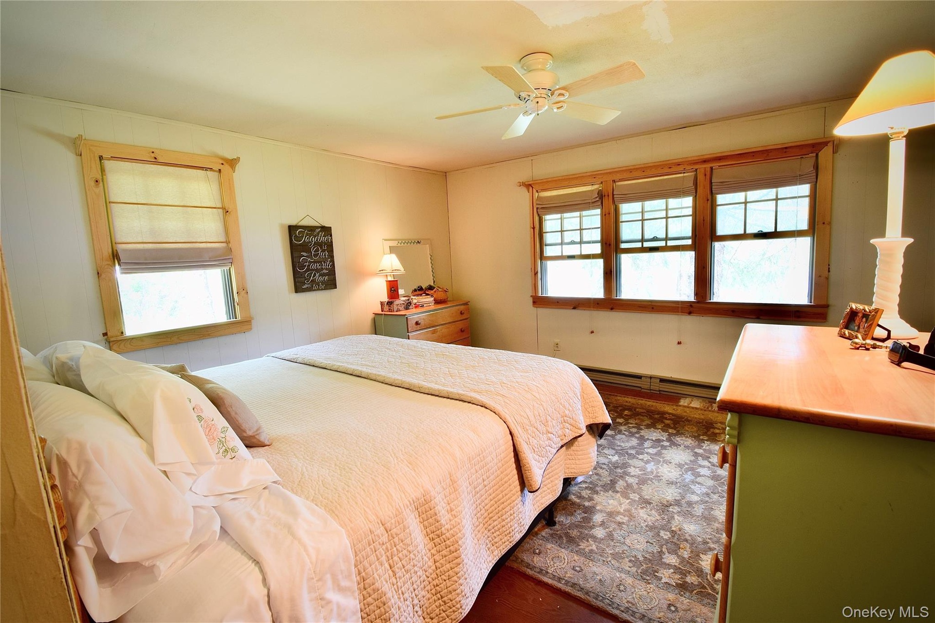 - Bedroom with multiple windows, wood finished floors, baseboard heating, and ceiling fan