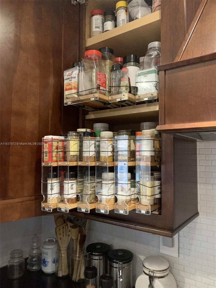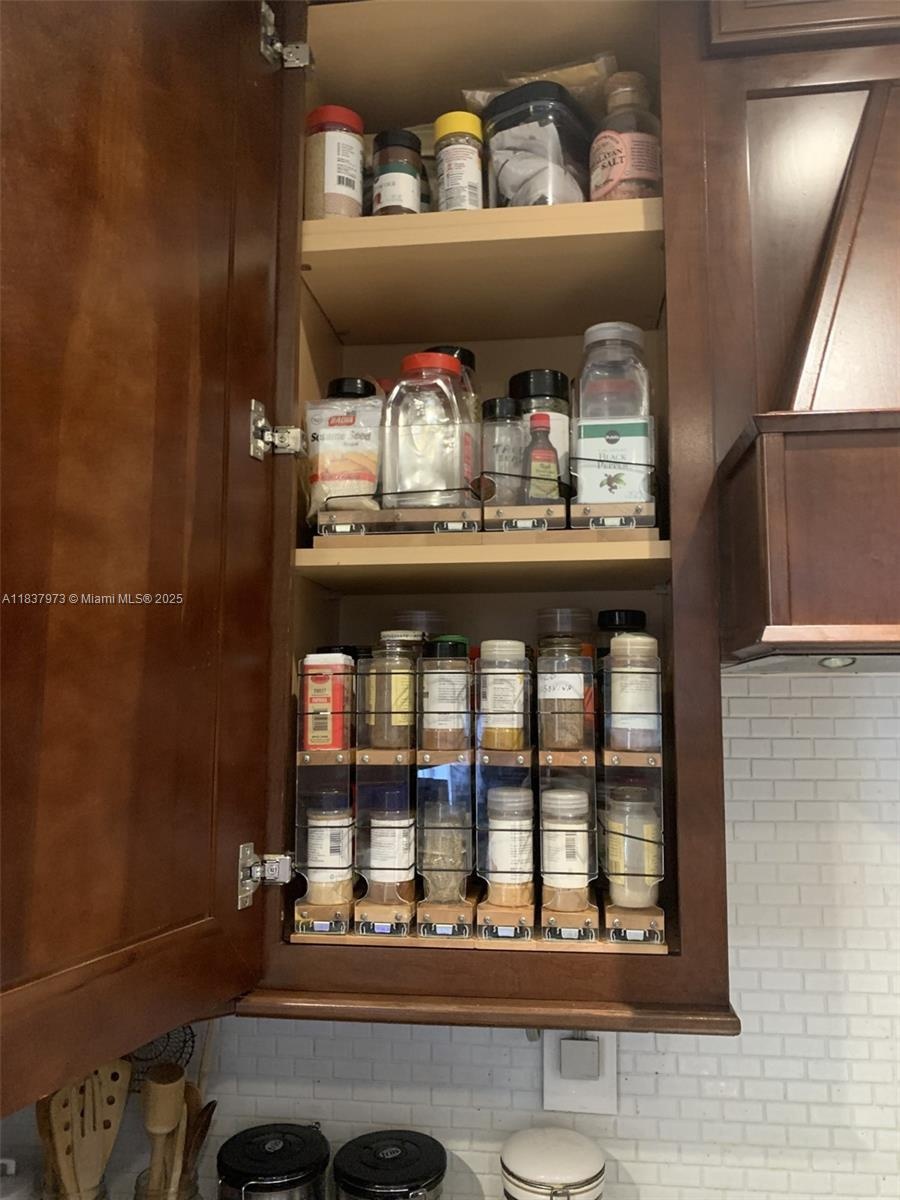 - Kitchen cabinet features built-in spice racks
