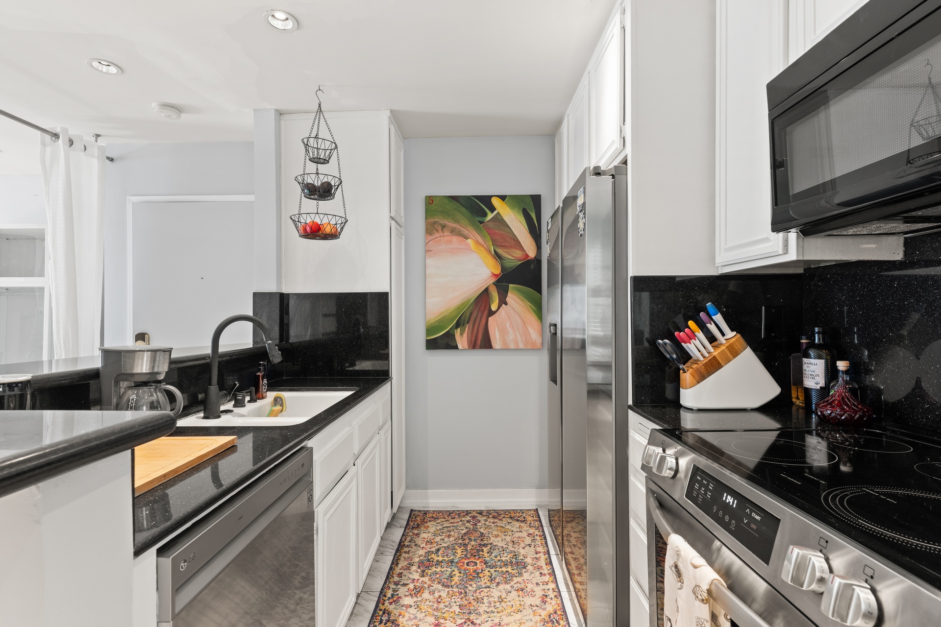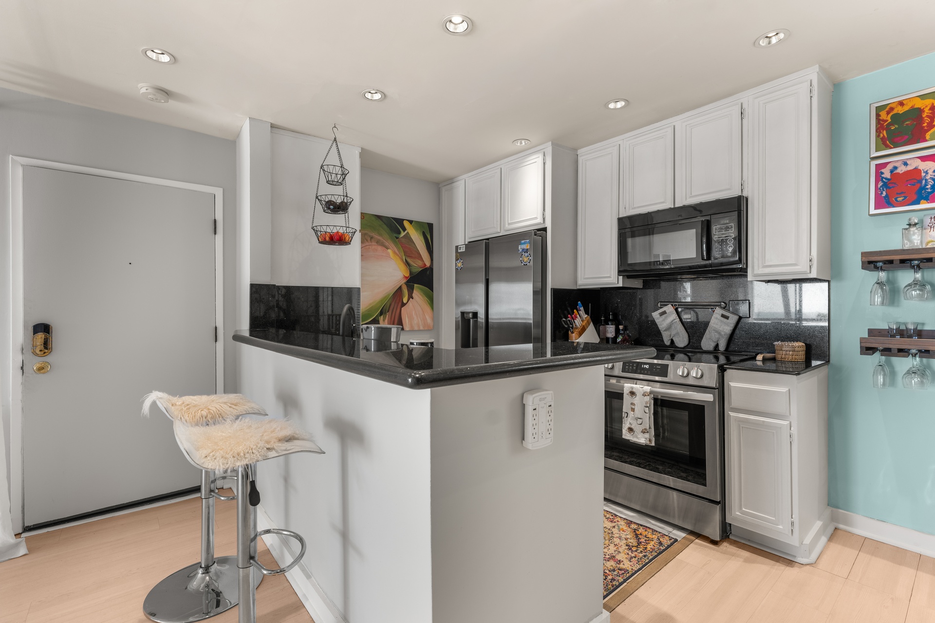 Stove/oven electric range, microwave, dishwasher, refrigerator with ice and water dispenser.