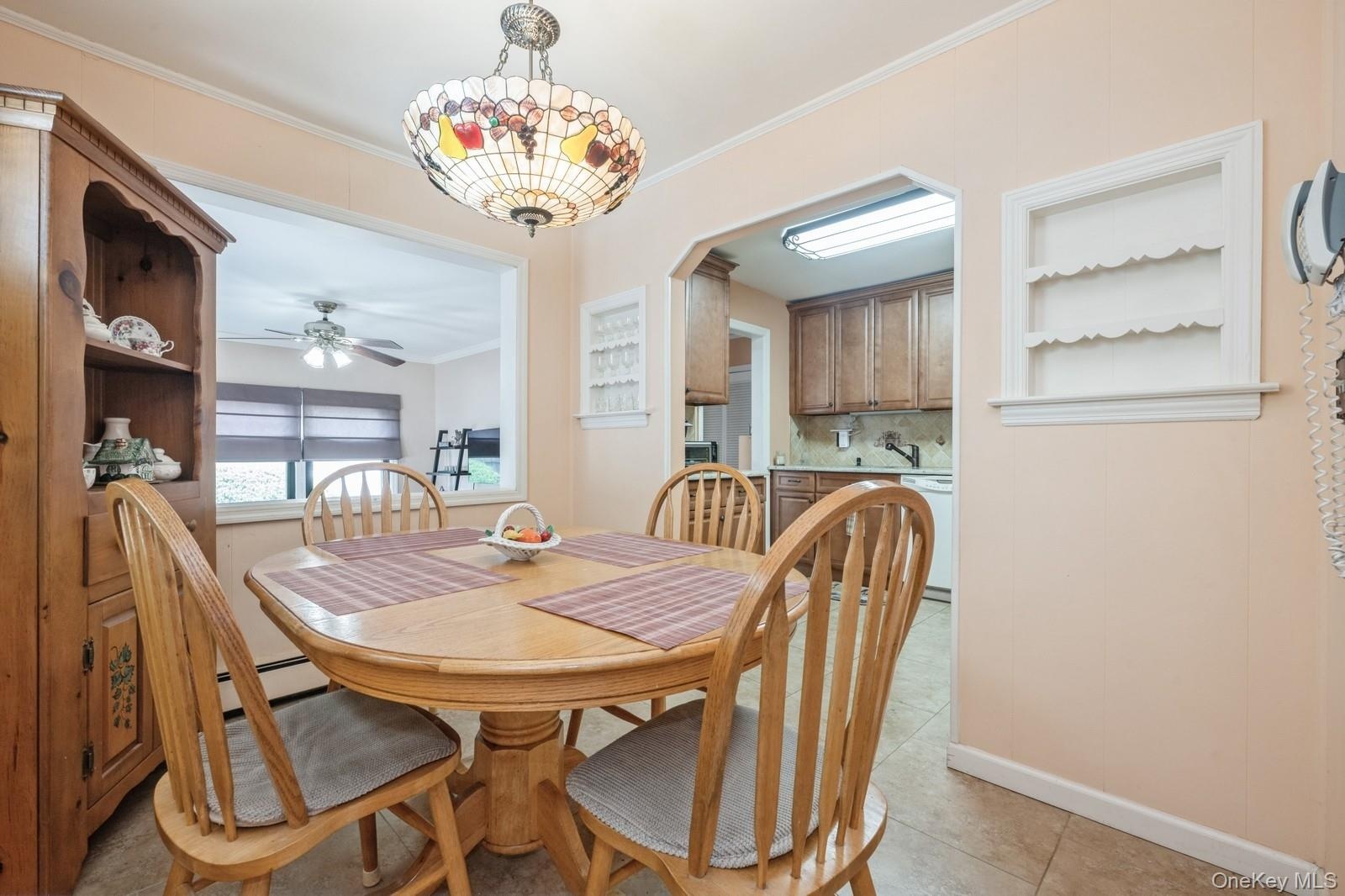 - Dining space featuring light tile patterned floors, a baseboard heating unit, ornamental molding, and ceiling fan