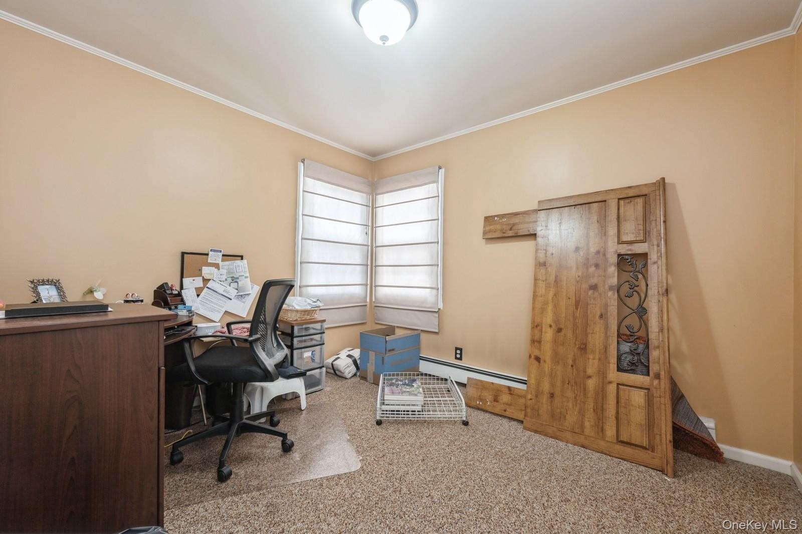 - Dining room featuring ornamental molding, a baseboard radiator, and a ceiling fan