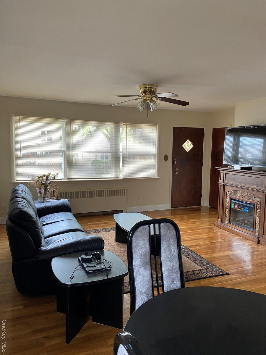 - Living area featuring radiator, wood finished floors, a ceiling fan, and a tile fireplace