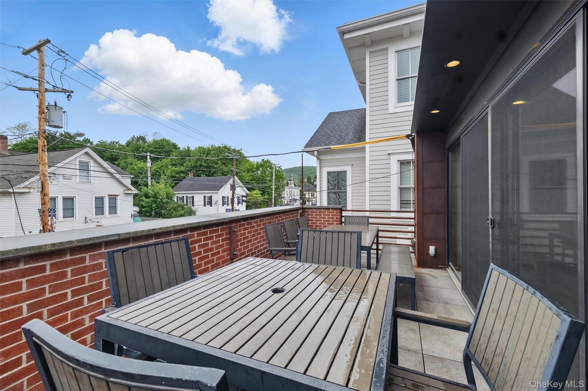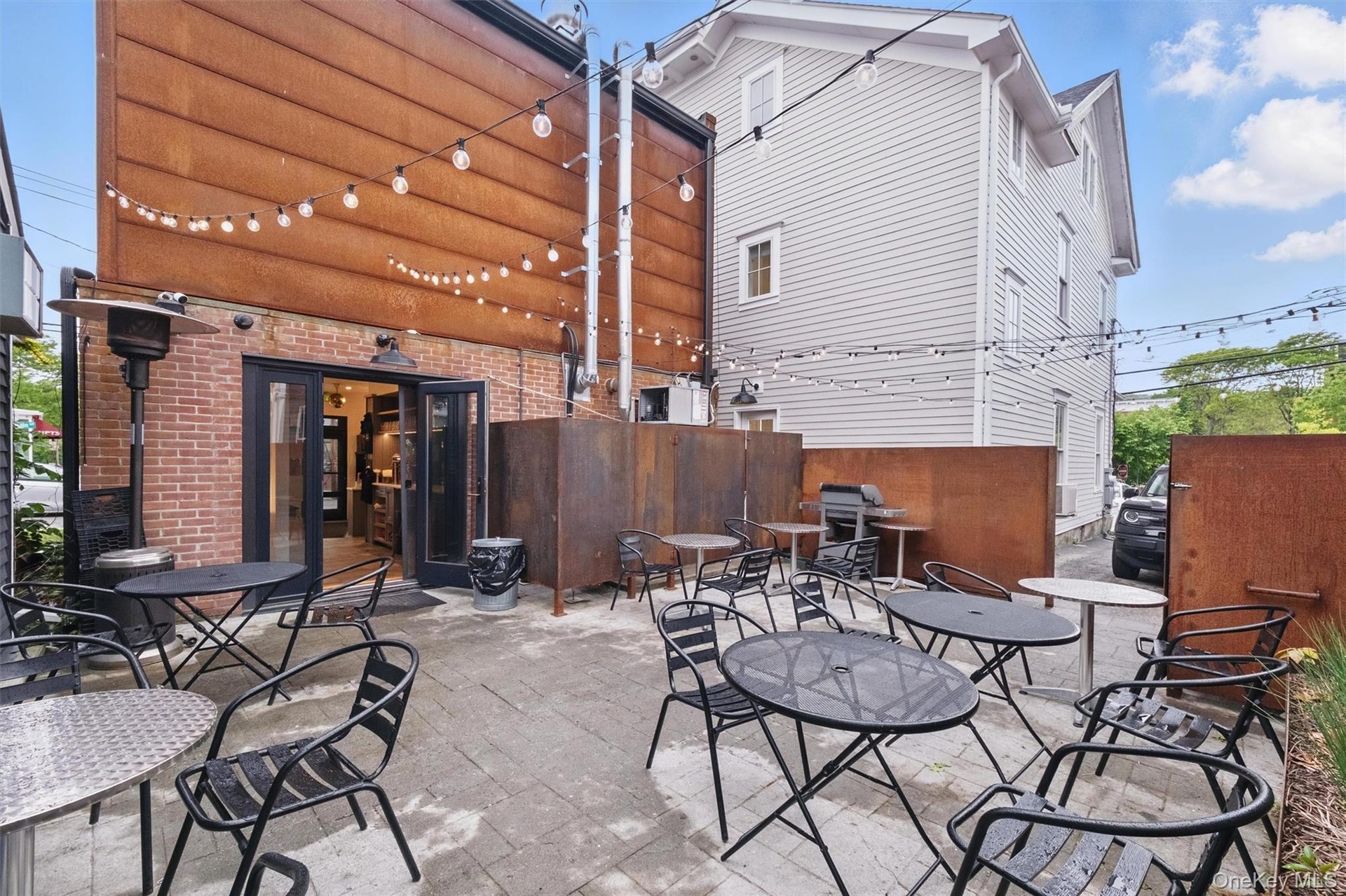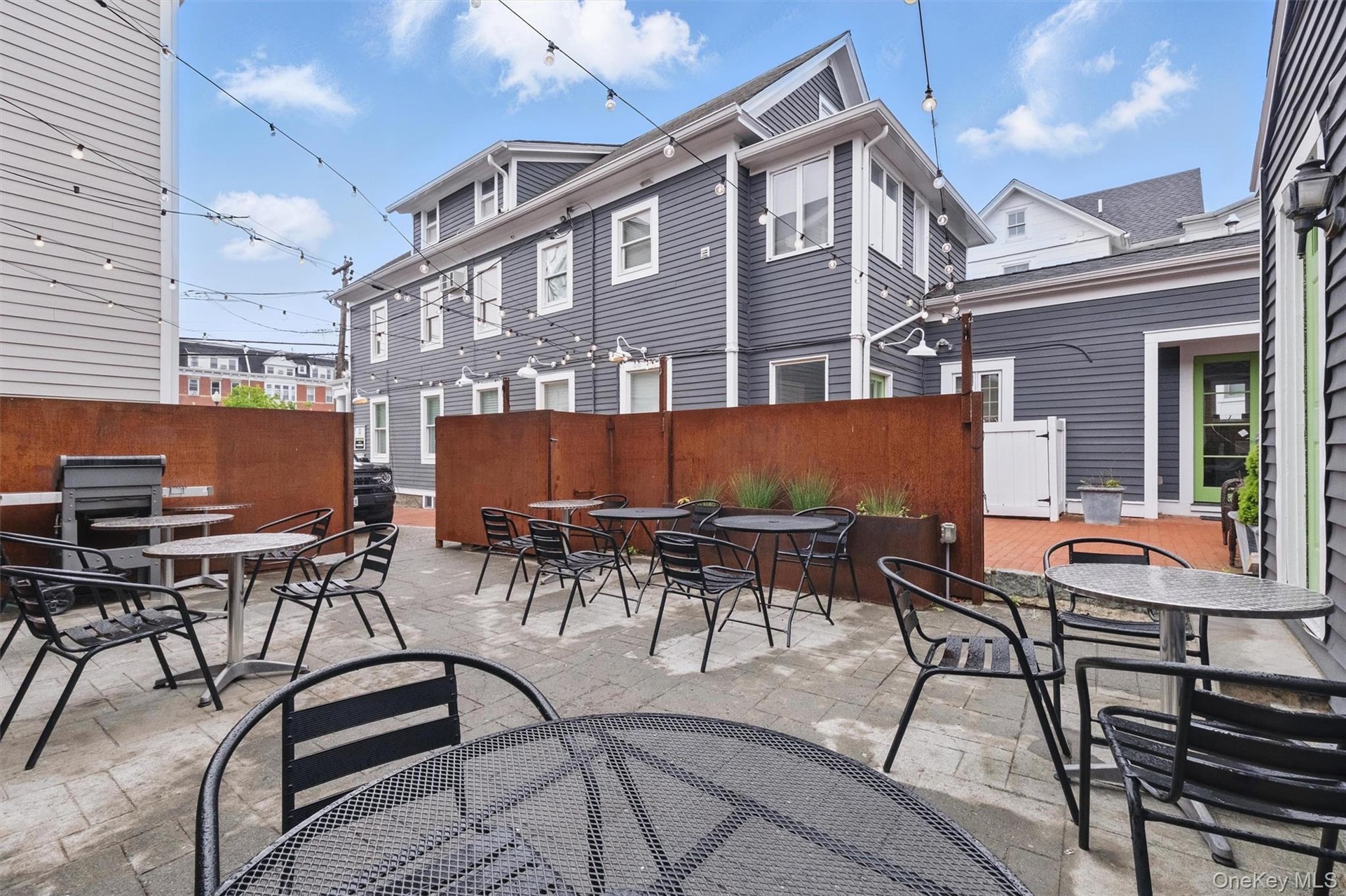 The space includes multiple inviting seating areas: a cozy upstairs lounge, a balcony with a view, and a private patio out back—ideal for relaxed dining or community gatherings. The walls feature rotating displays of local artwork, enhancing the warm and creative ambiance.