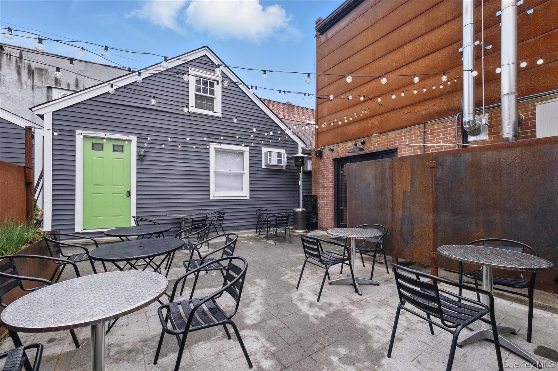 - View of patio featuring a wall mounted air conditioner and outdoor dining area