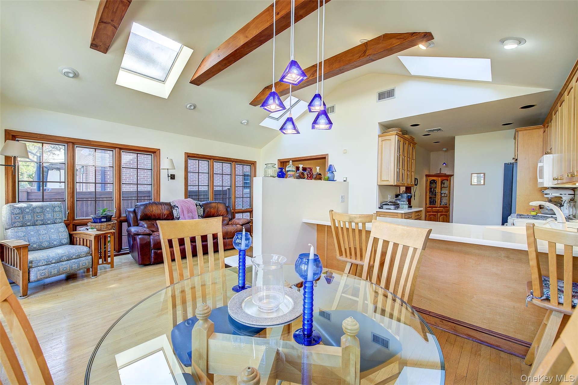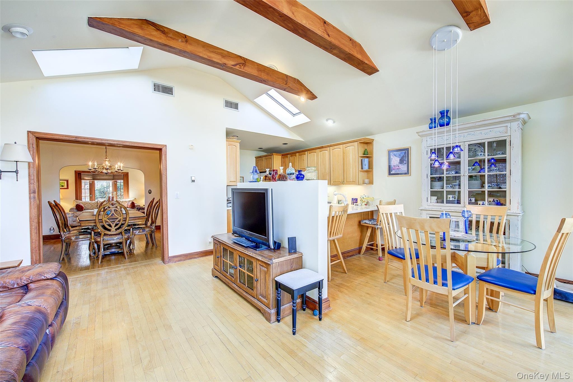 - Dining room with a skylight, light wood-style flooring, beamed ceiling, and high vaulted ceiling