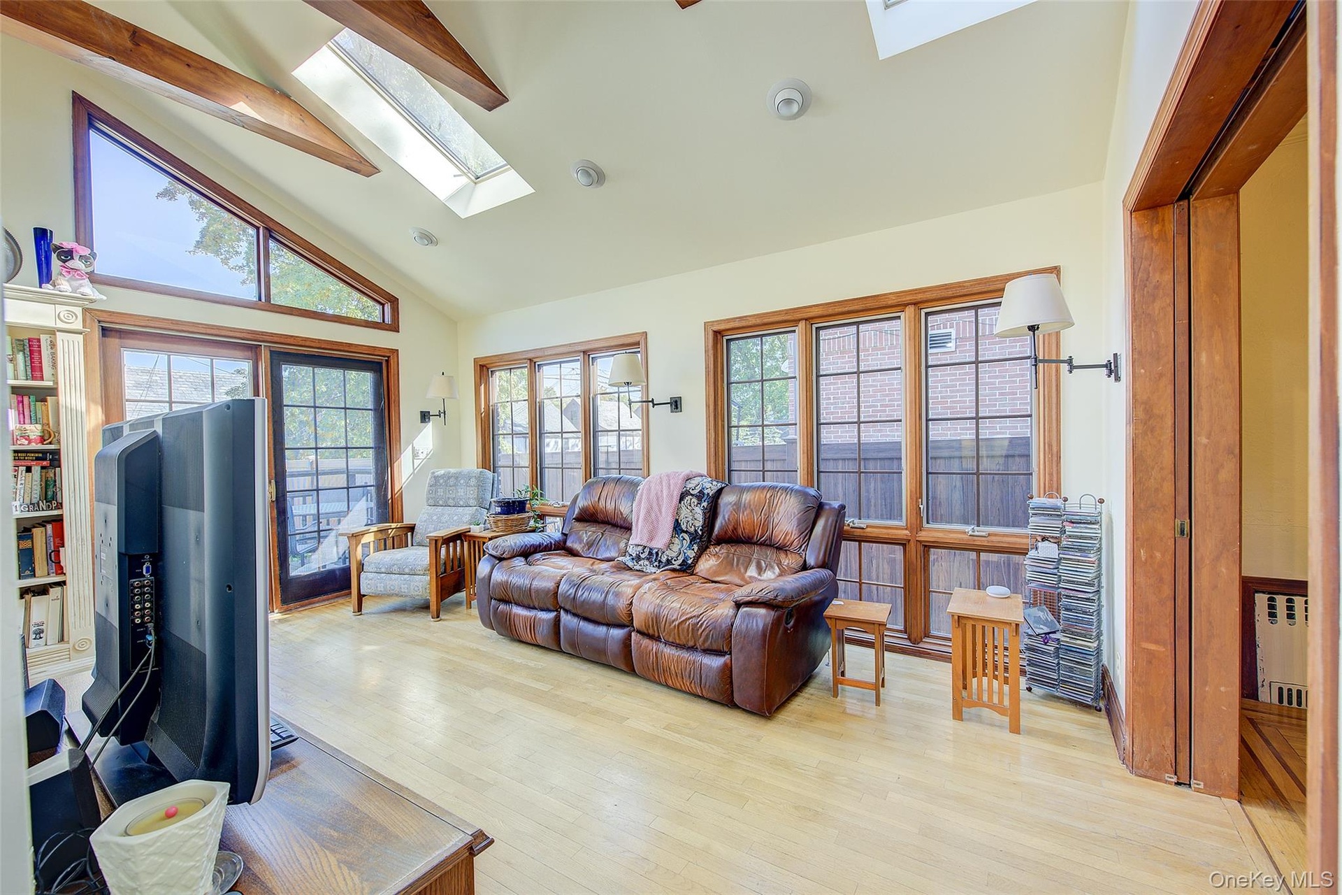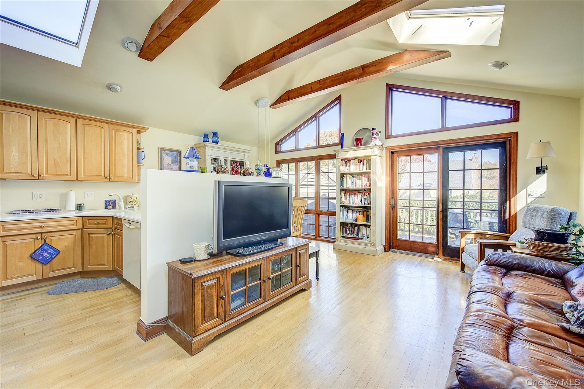 - Living room with a skylight, beamed ceiling, high vaulted ceiling, light wood-type flooring, and healthy amount of natural light