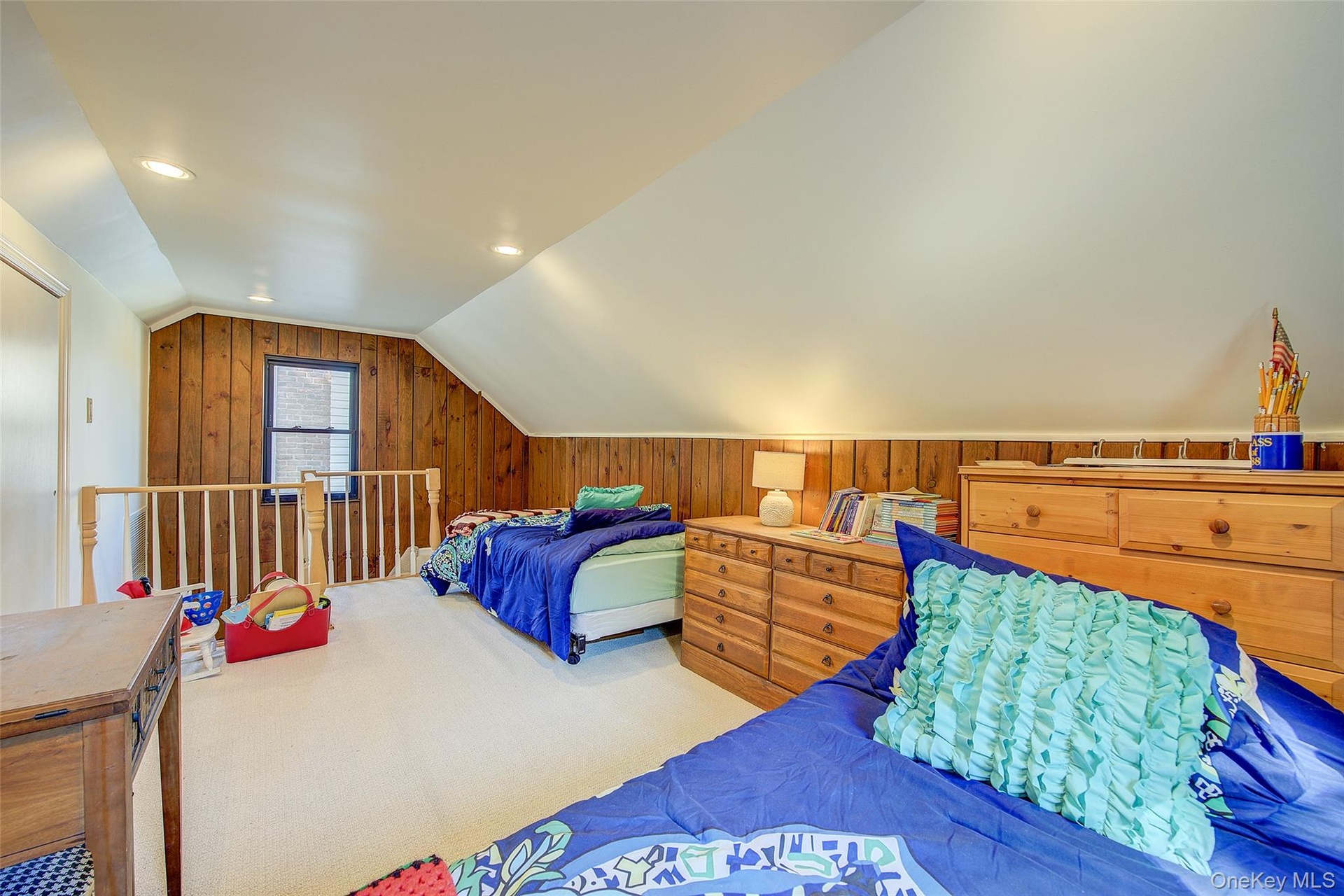 - Carpeted bedroom with lofted ceiling, wood walls, and recessed lighting