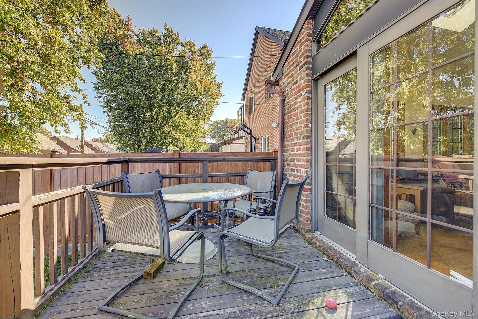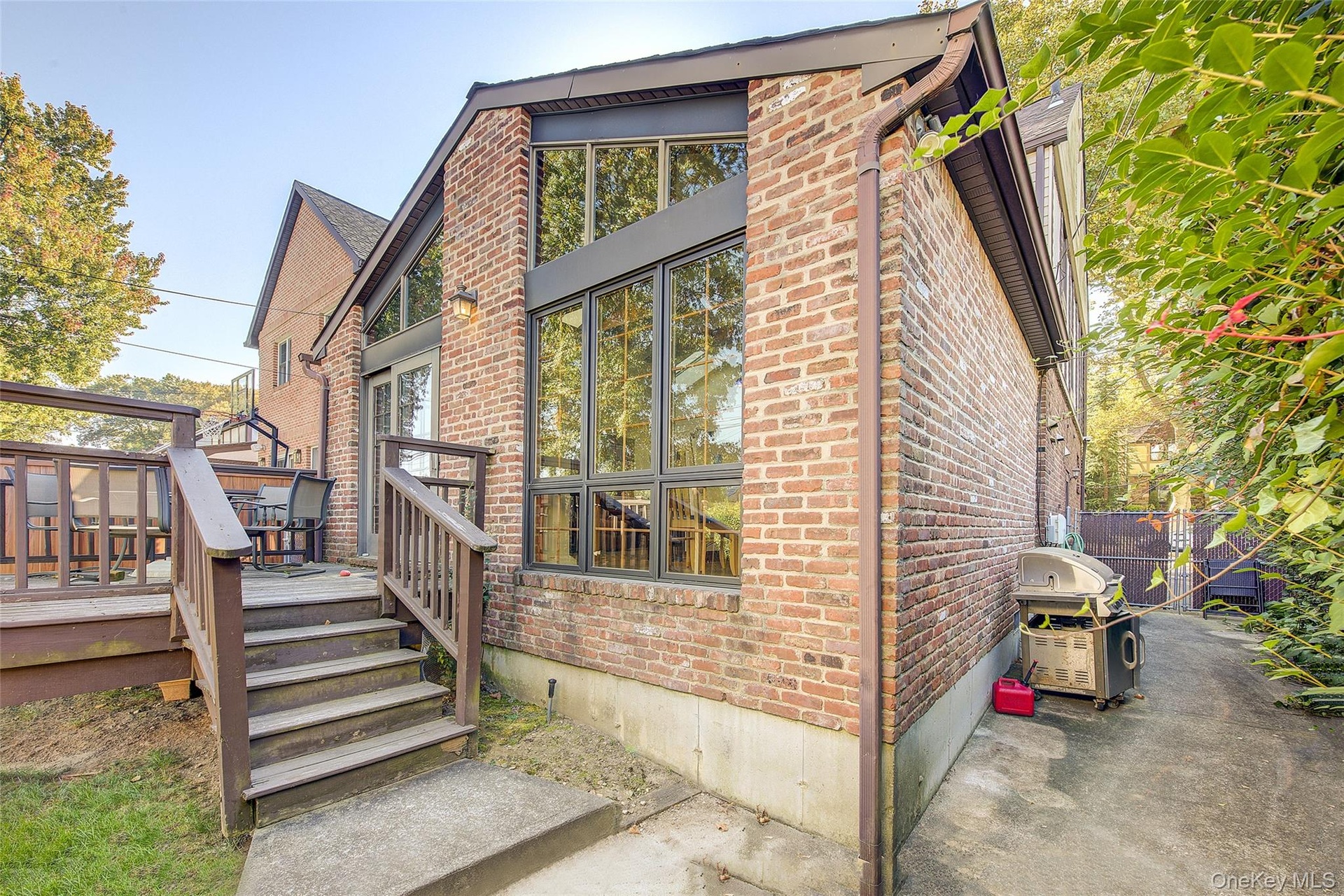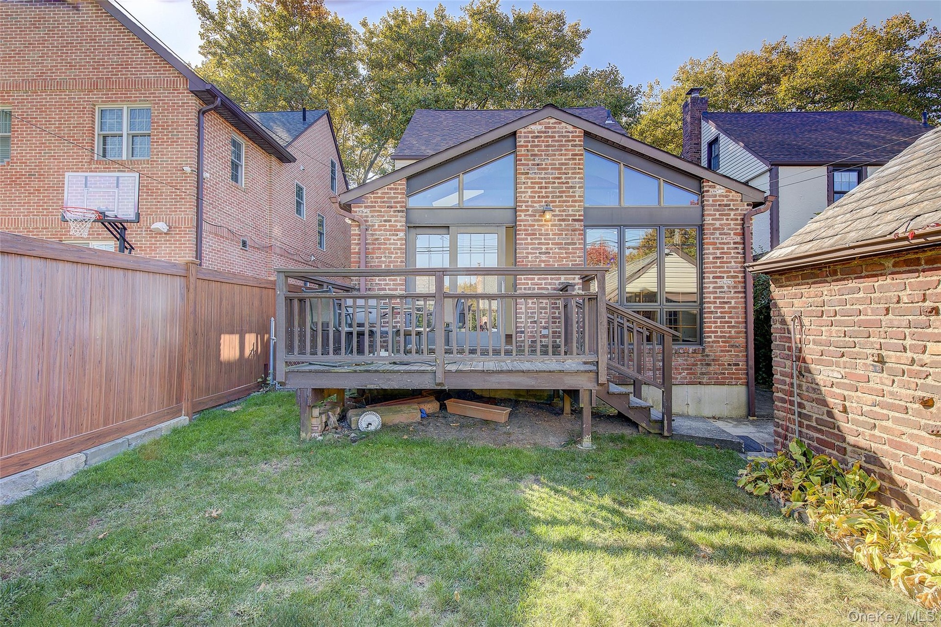 - Back of property with brick siding, a wooden deck, and a sunroom