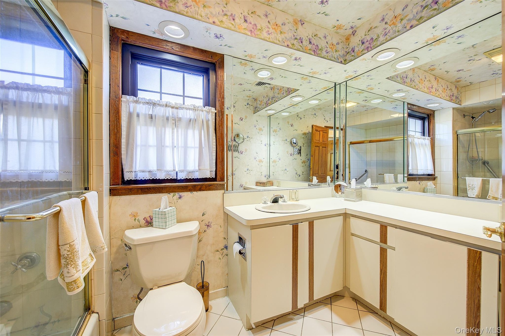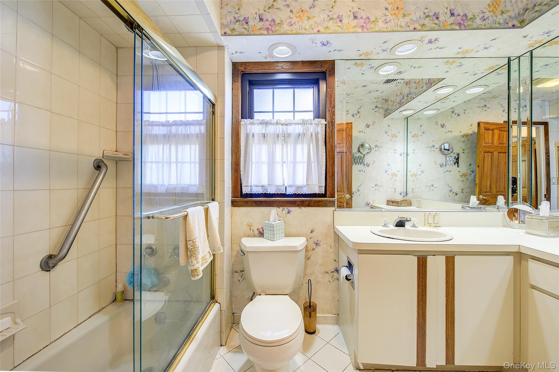 - Full bathroom featuring vanity, an enclosed shower, tile patterned floors, and wallpapered walls