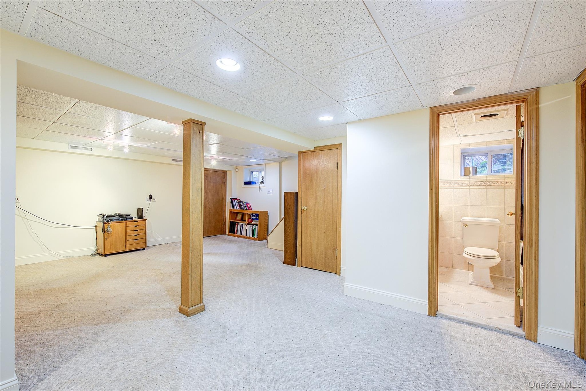 - Basement featuring a paneled ceiling, light colored carpet, and recessed lighting