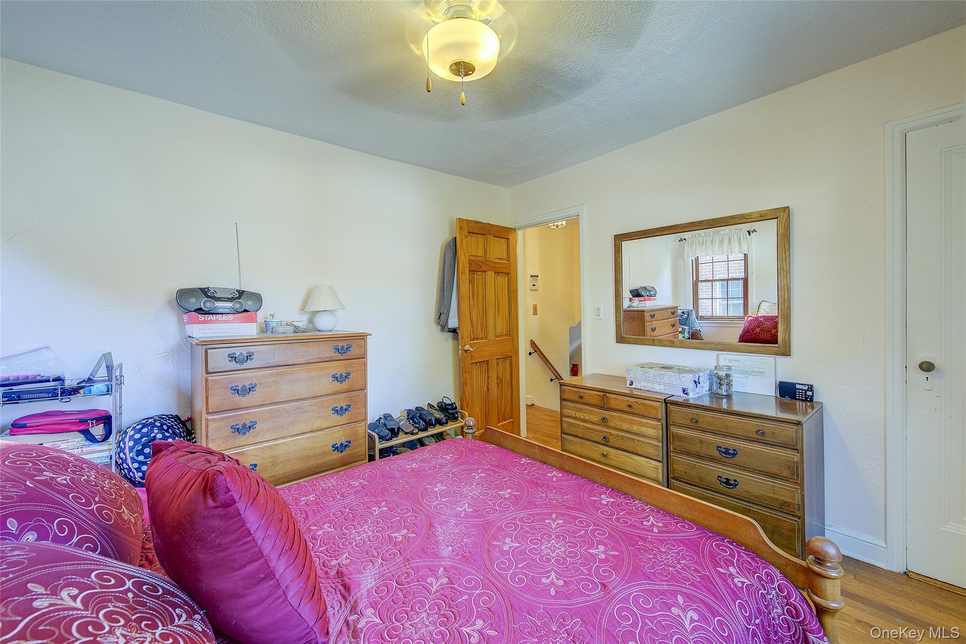 - Bedroom featuring light wood finished floors and lofted ceiling