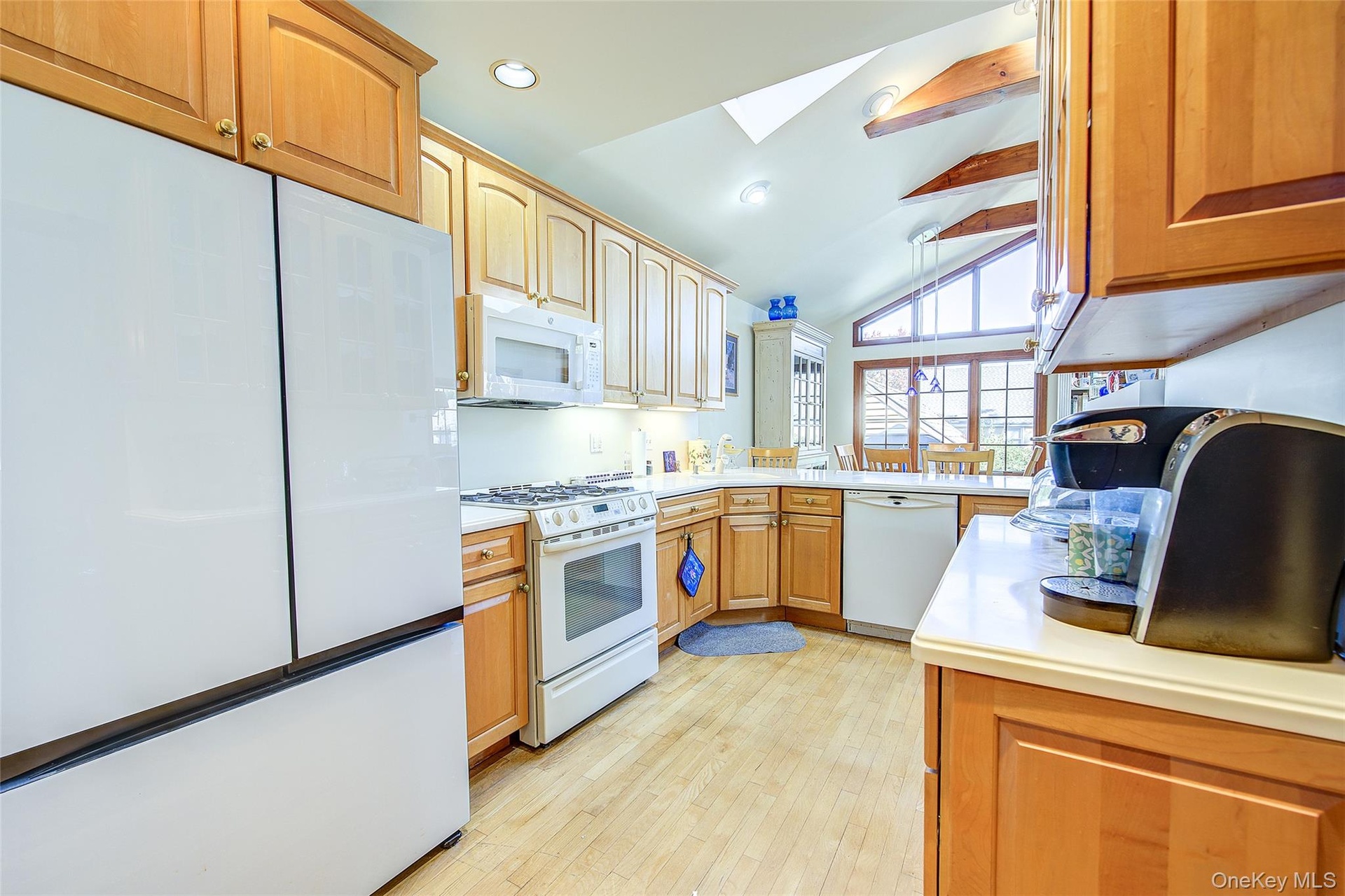 - Kitchen with white appliances, light countertops, light wood-style floors, vaulted ceiling, and a skylight
