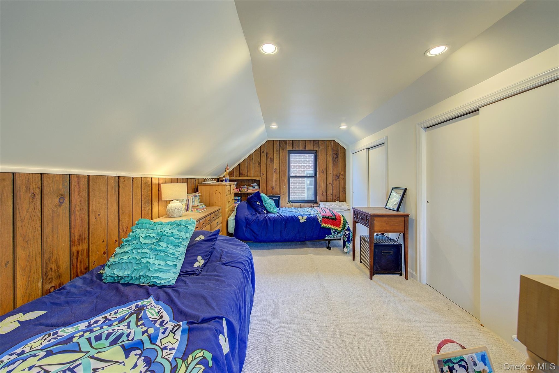 - Bedroom with lofted ceiling, light colored carpet, wood walls, multiple closets, and recessed lighting