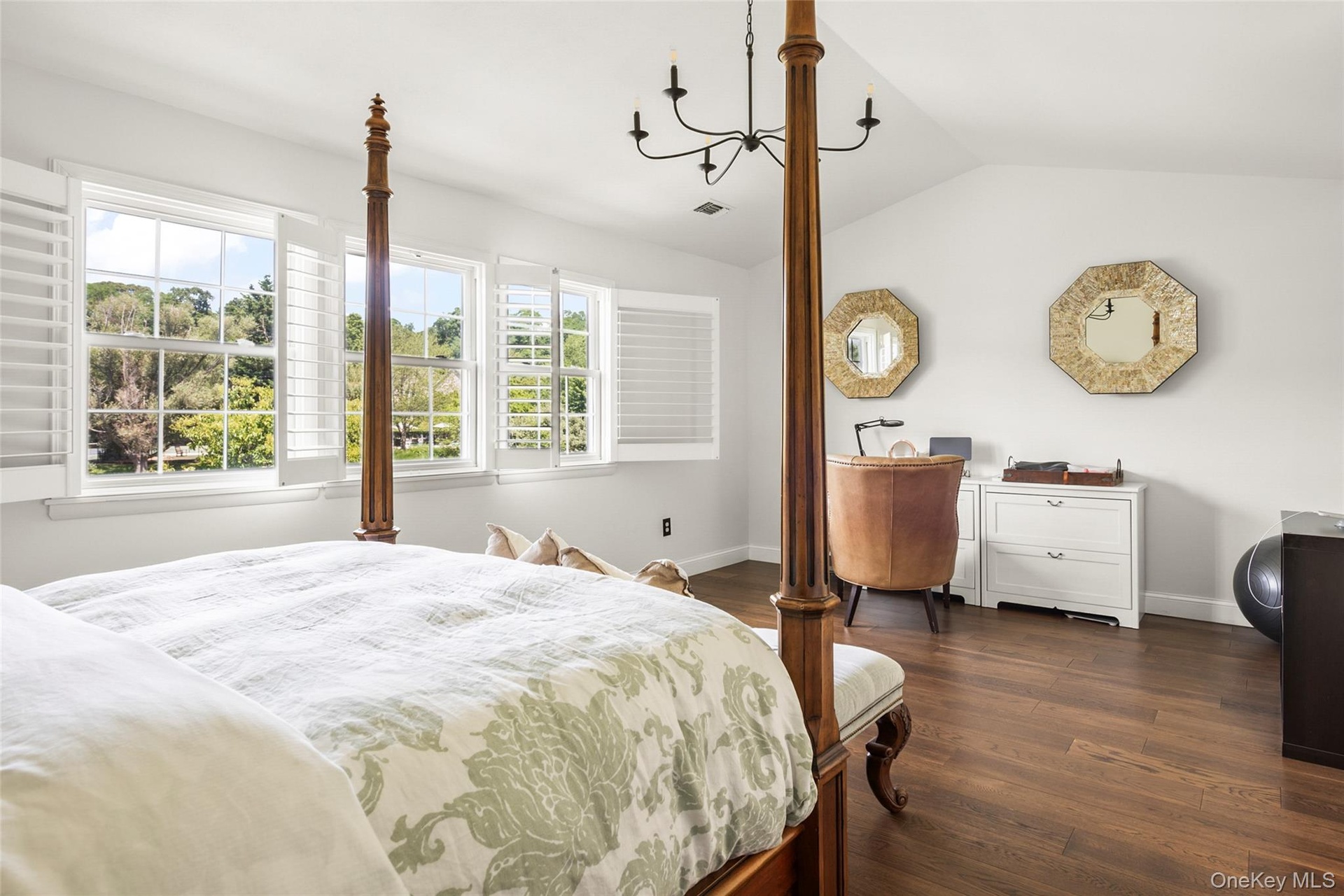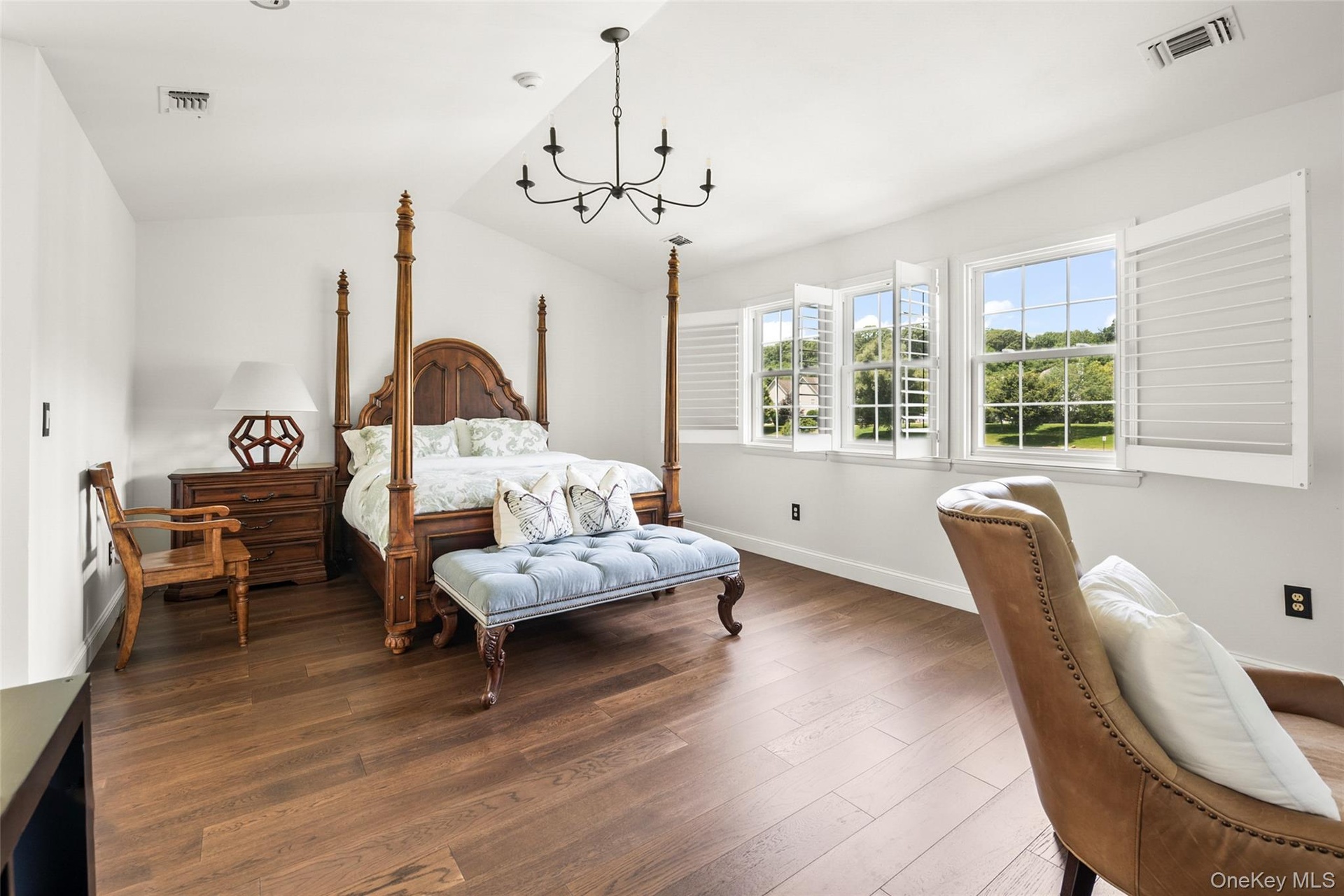 - Bedroom featuring wood finished floors, lofted ceiling, and a chandelier
