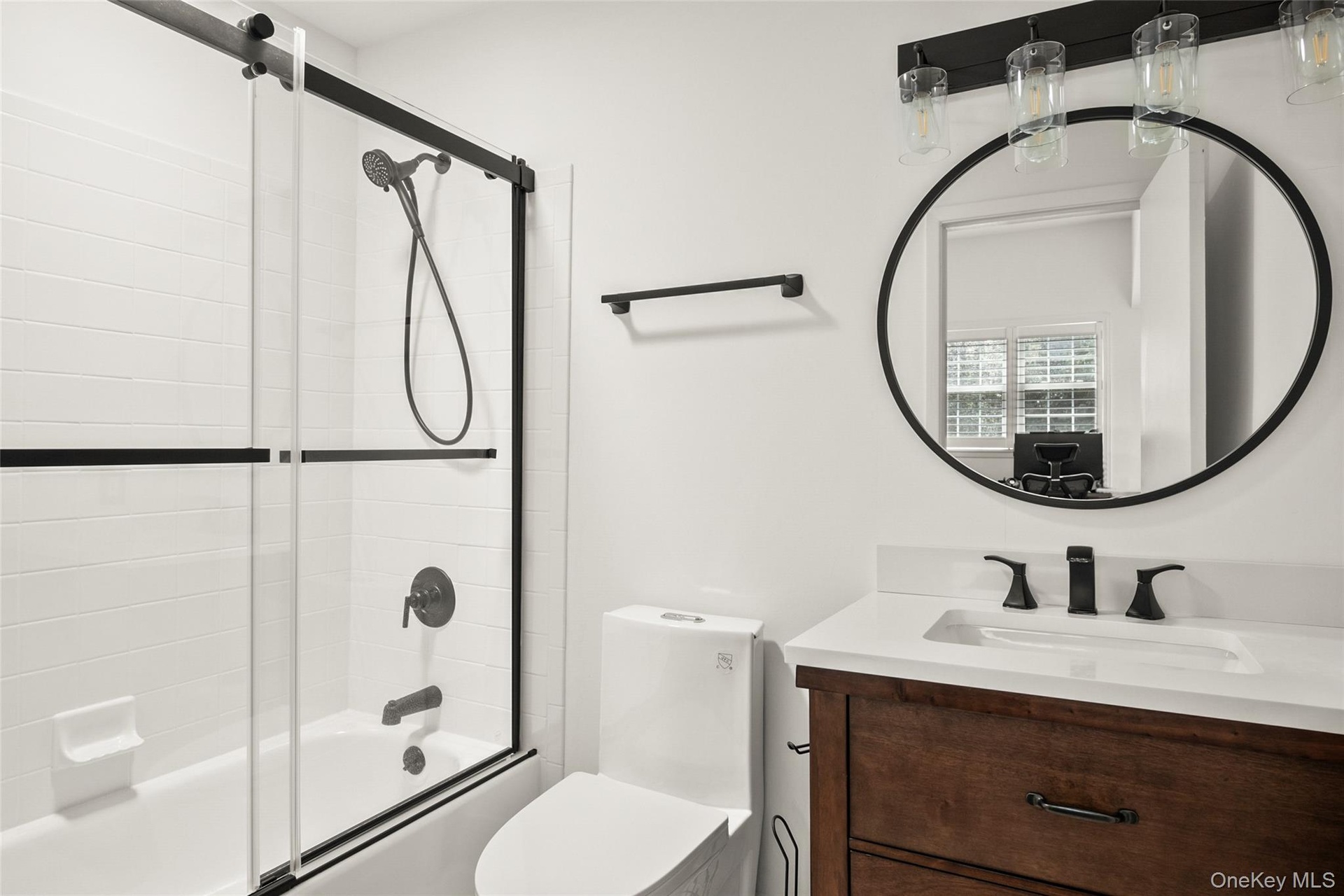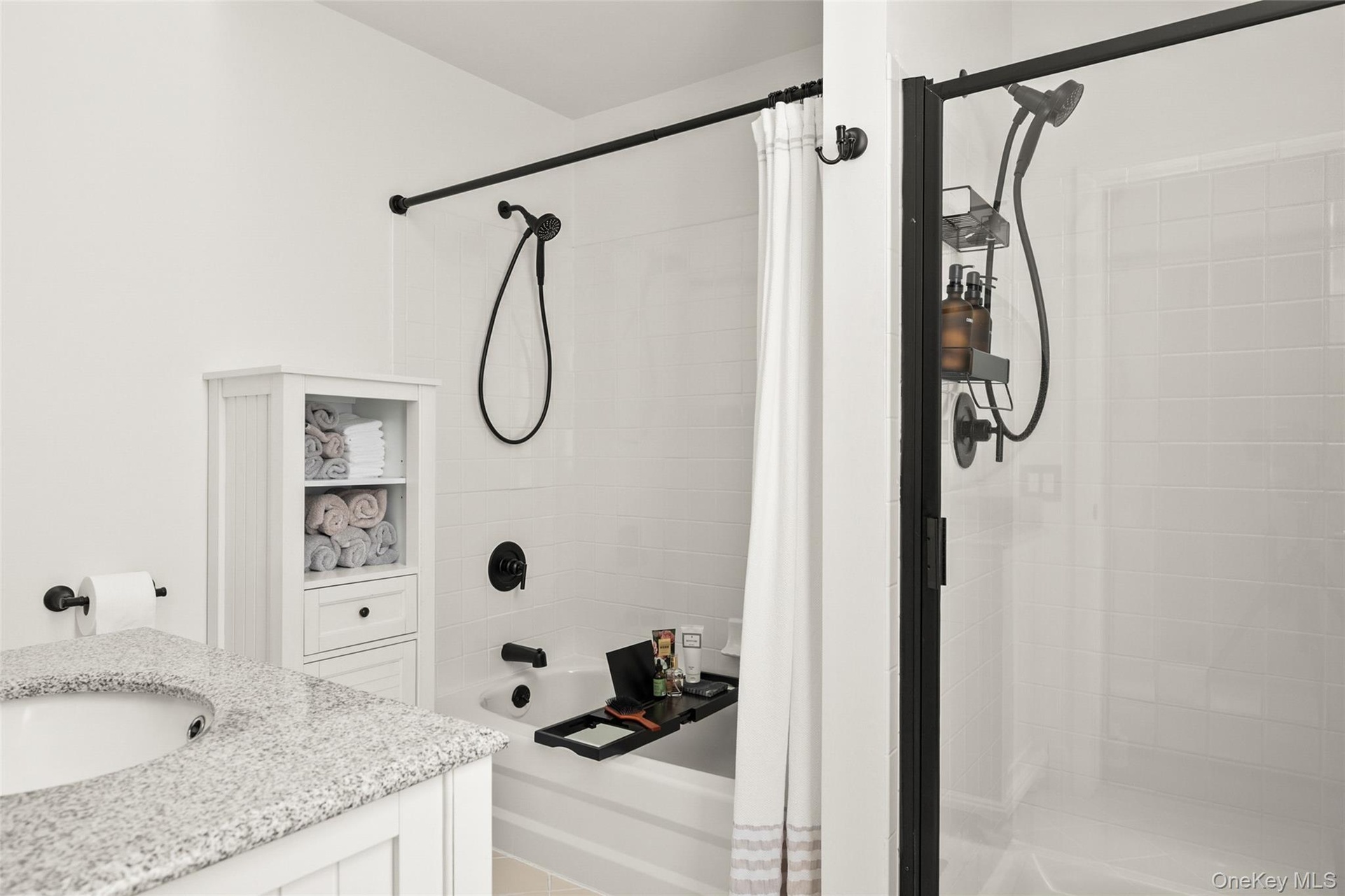 - Bathroom featuring vanity and shower / bathtub combination with curtain