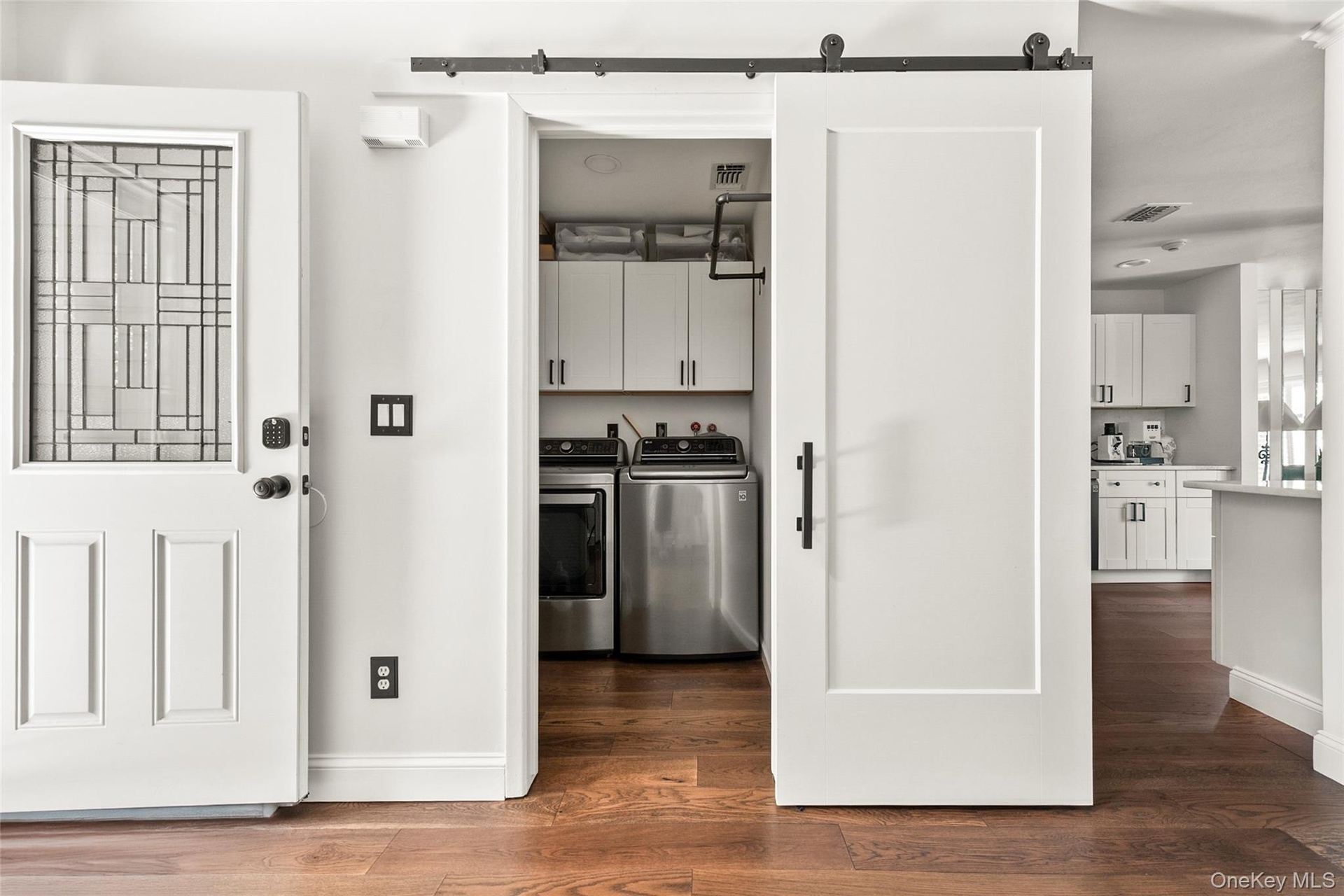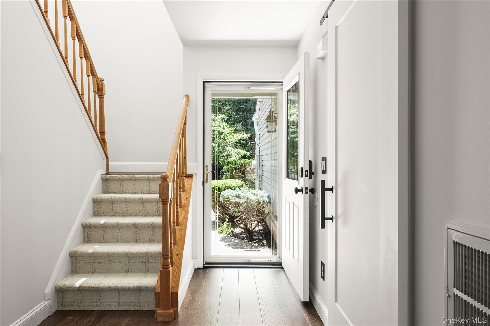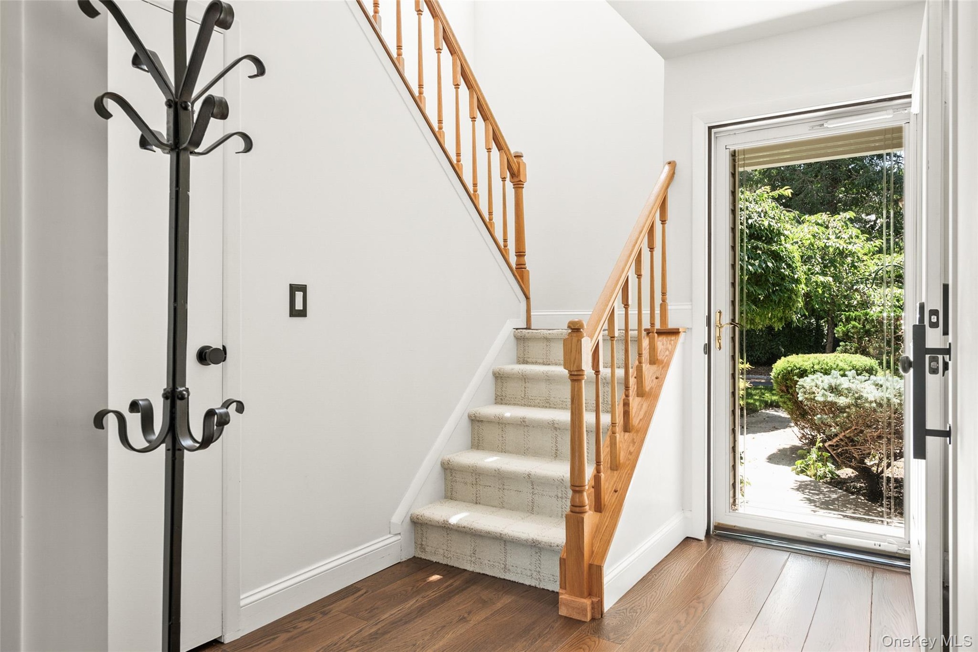 - Entrance foyer featuring stairway and dark wood-style flooring