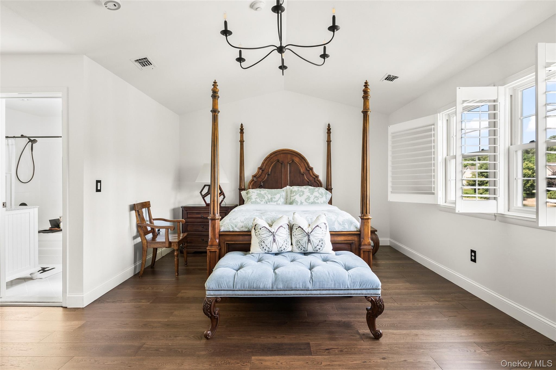 - Bedroom with a chandelier, dark wood-type flooring, and lofted ceiling