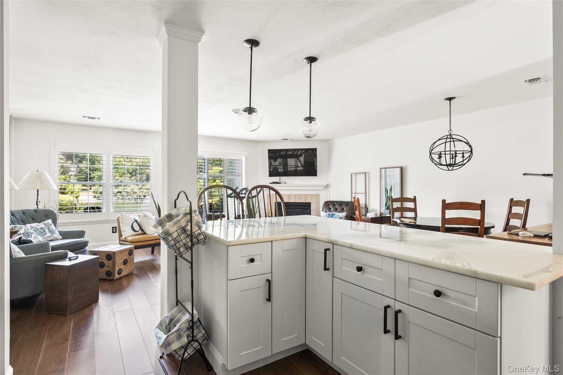 - Kitchen featuring open floor plan, dark wood-style floors, decorative light fixtures, and a fireplace