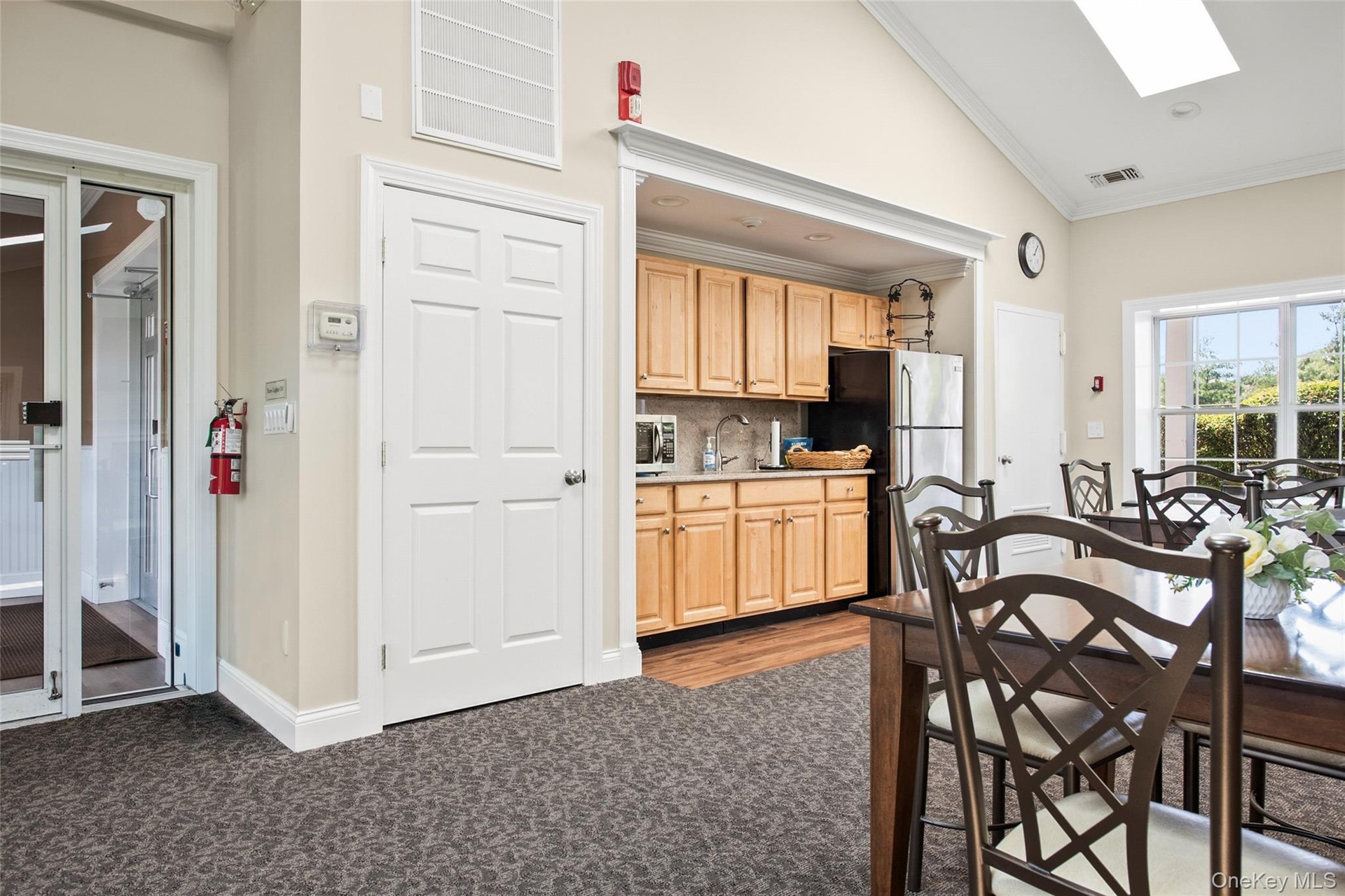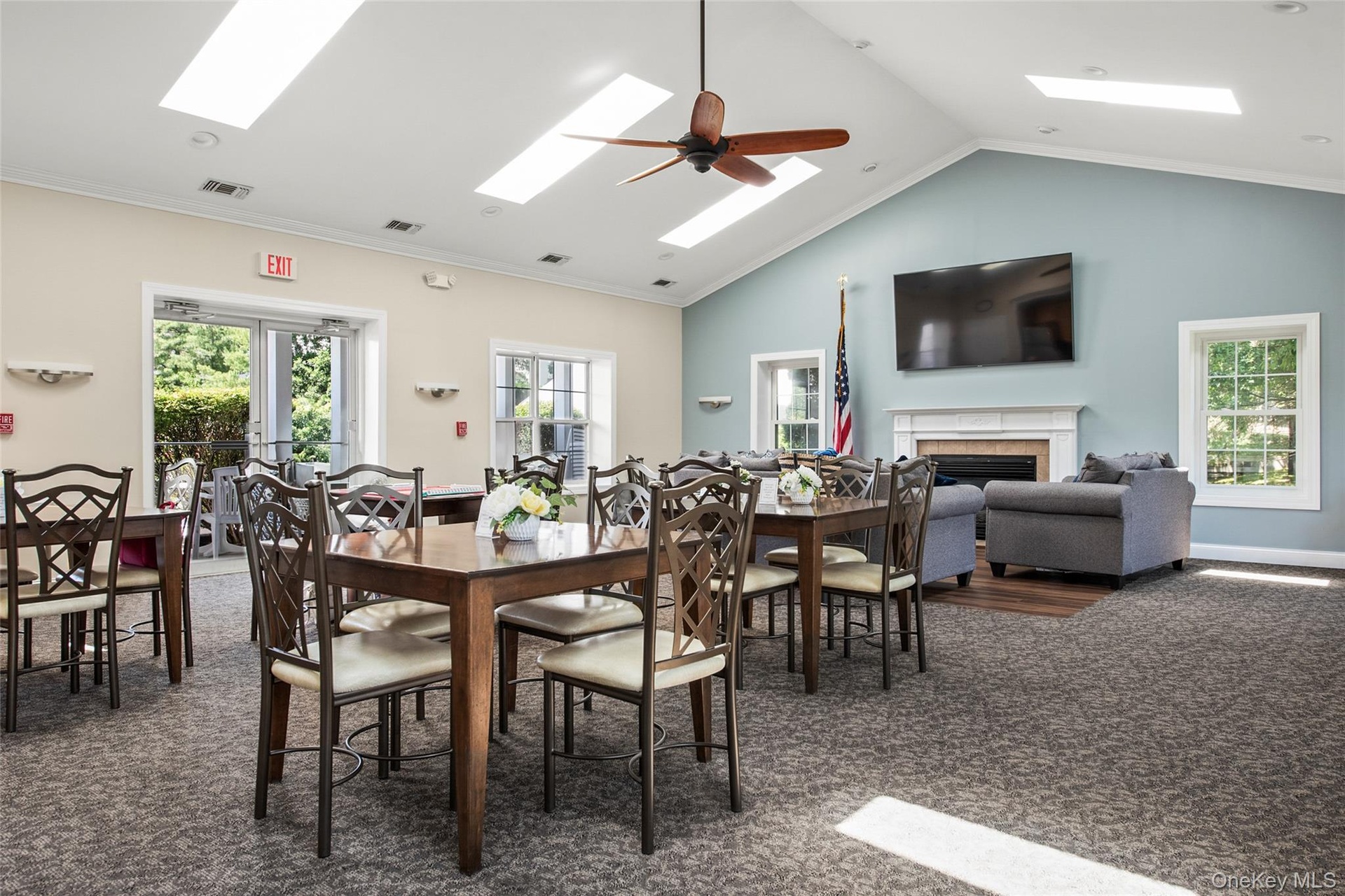 - Dining room featuring a skylight, dark colored carpet, a fireplace, vaulted ceiling, and crown molding