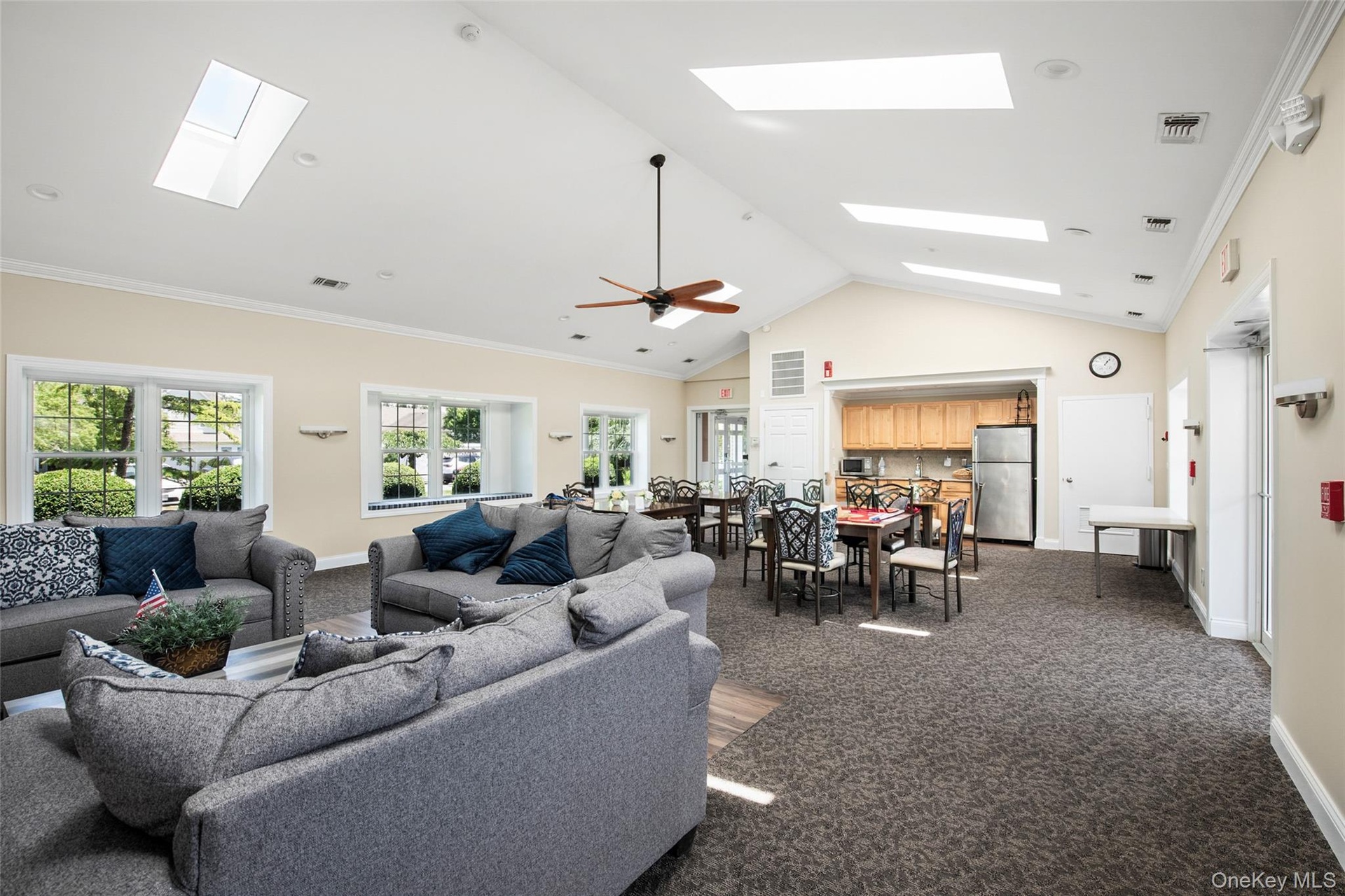 - Living area featuring a skylight, lofted ceiling, dark colored carpet, ornamental molding, and ceiling fan