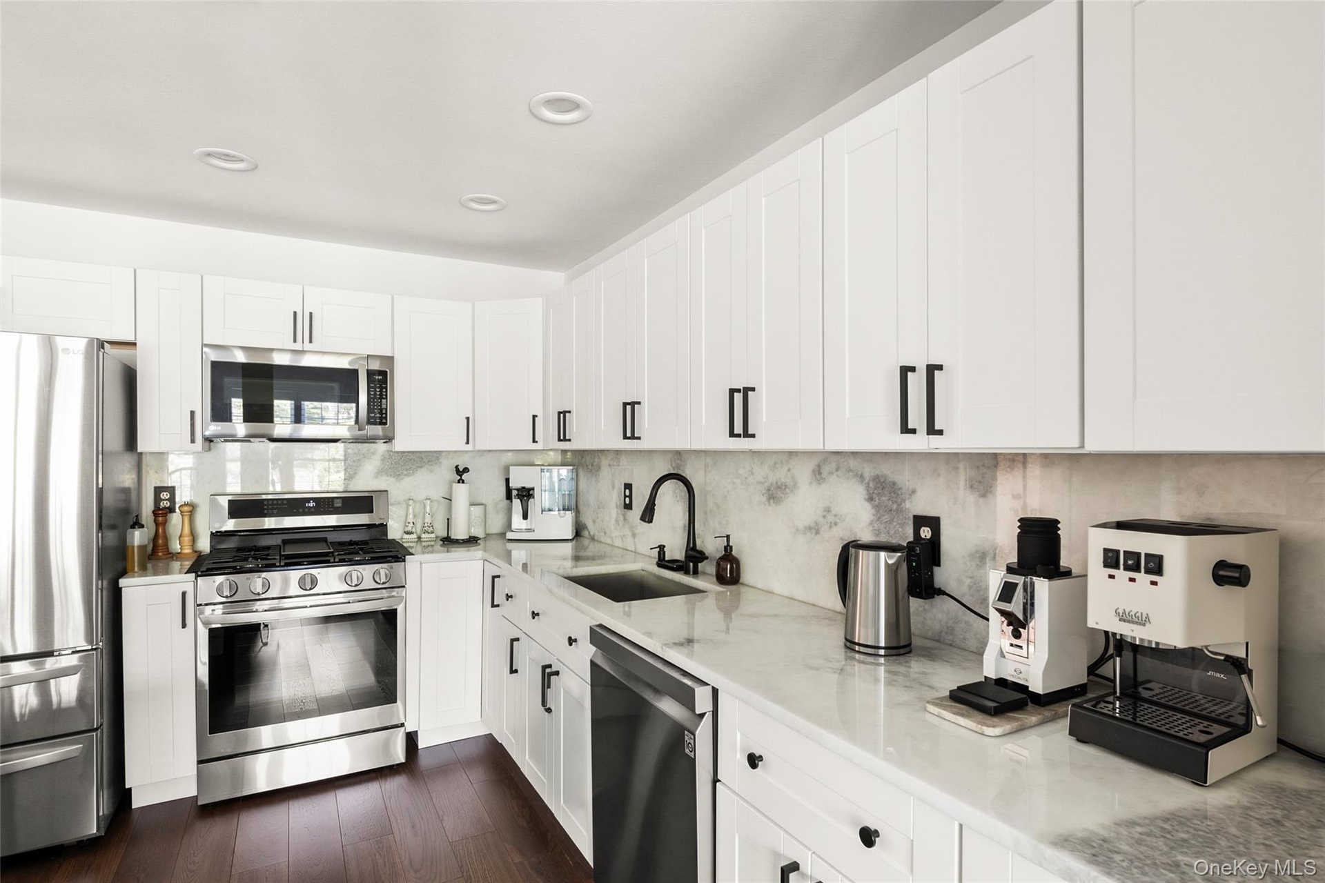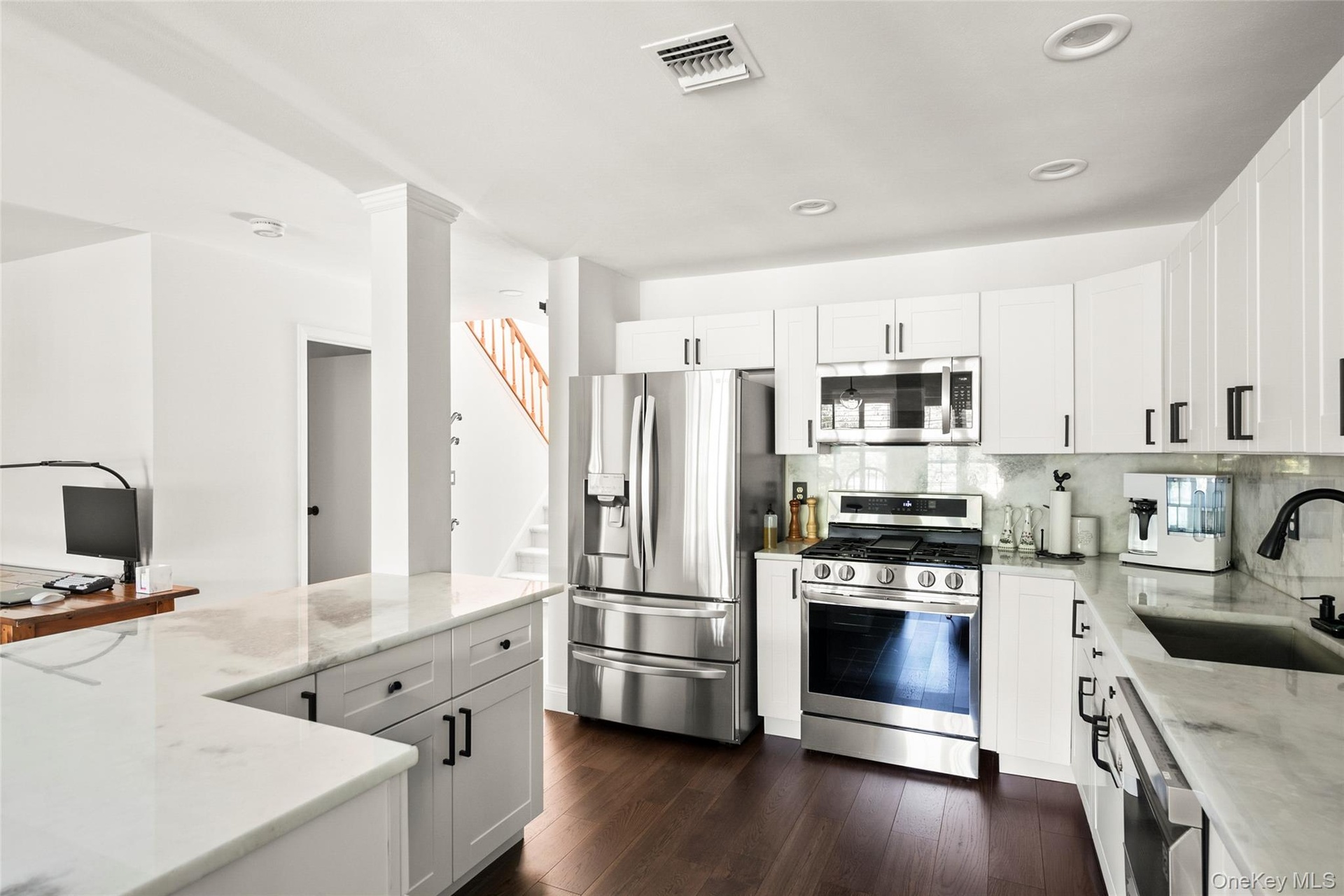 - Kitchen with stainless steel appliances, light stone countertops, backsplash, white cabinets, and dark wood-style flooring