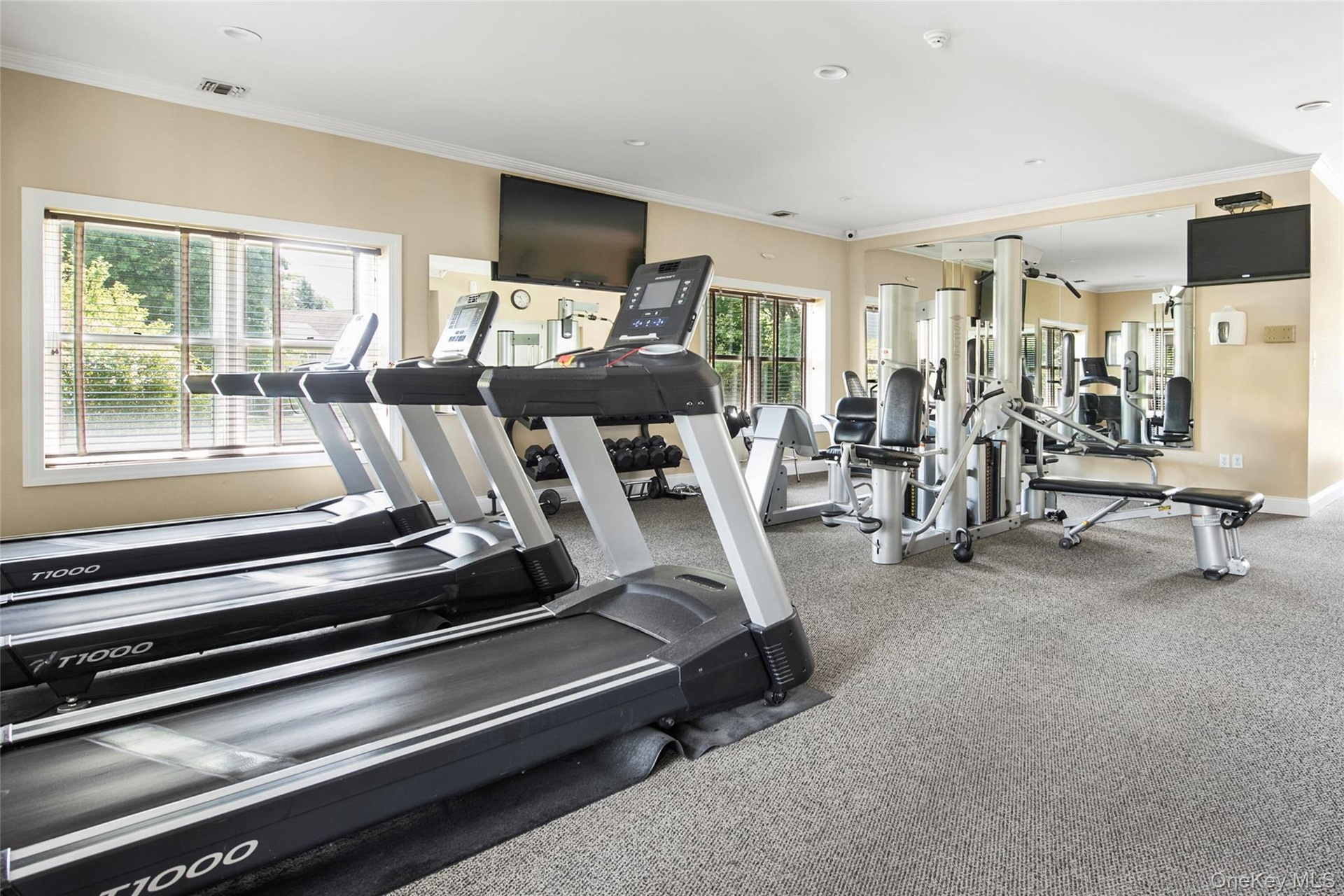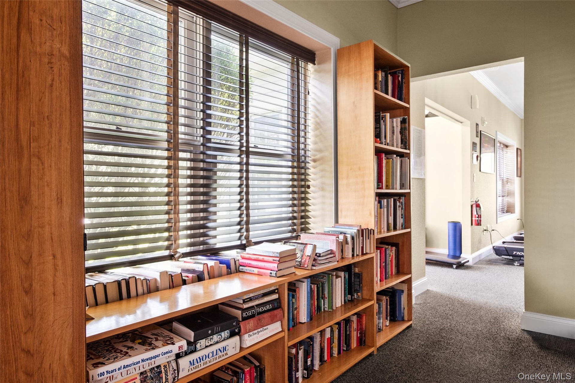 - Corridor featuring crown molding, carpet flooring, and plenty of natural light