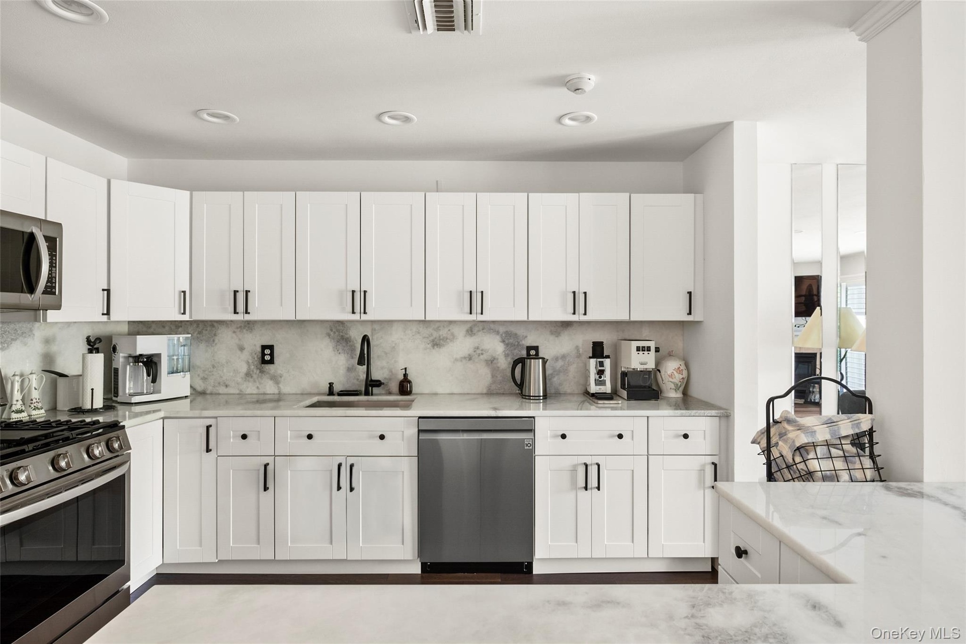 - Kitchen featuring stainless steel appliances, light stone counters, white cabinets, decorative backsplash, and recessed lighting