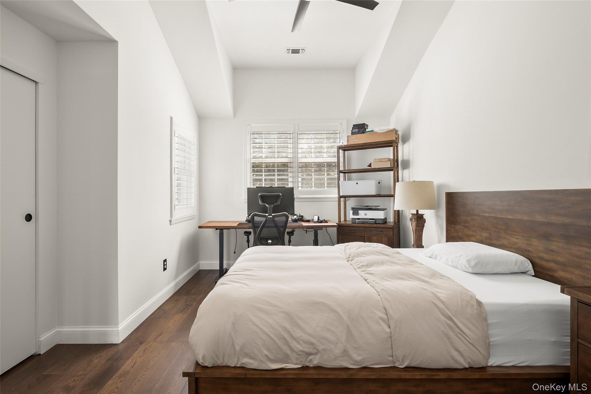 - Bedroom featuring dark wood-type flooring, an office area, and a ceiling fan