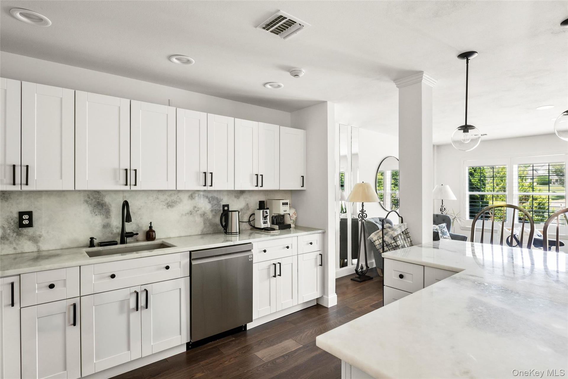 - Kitchen featuring dishwasher, dark wood-type flooring, backsplash, white cabinetry, and pendant lighting
