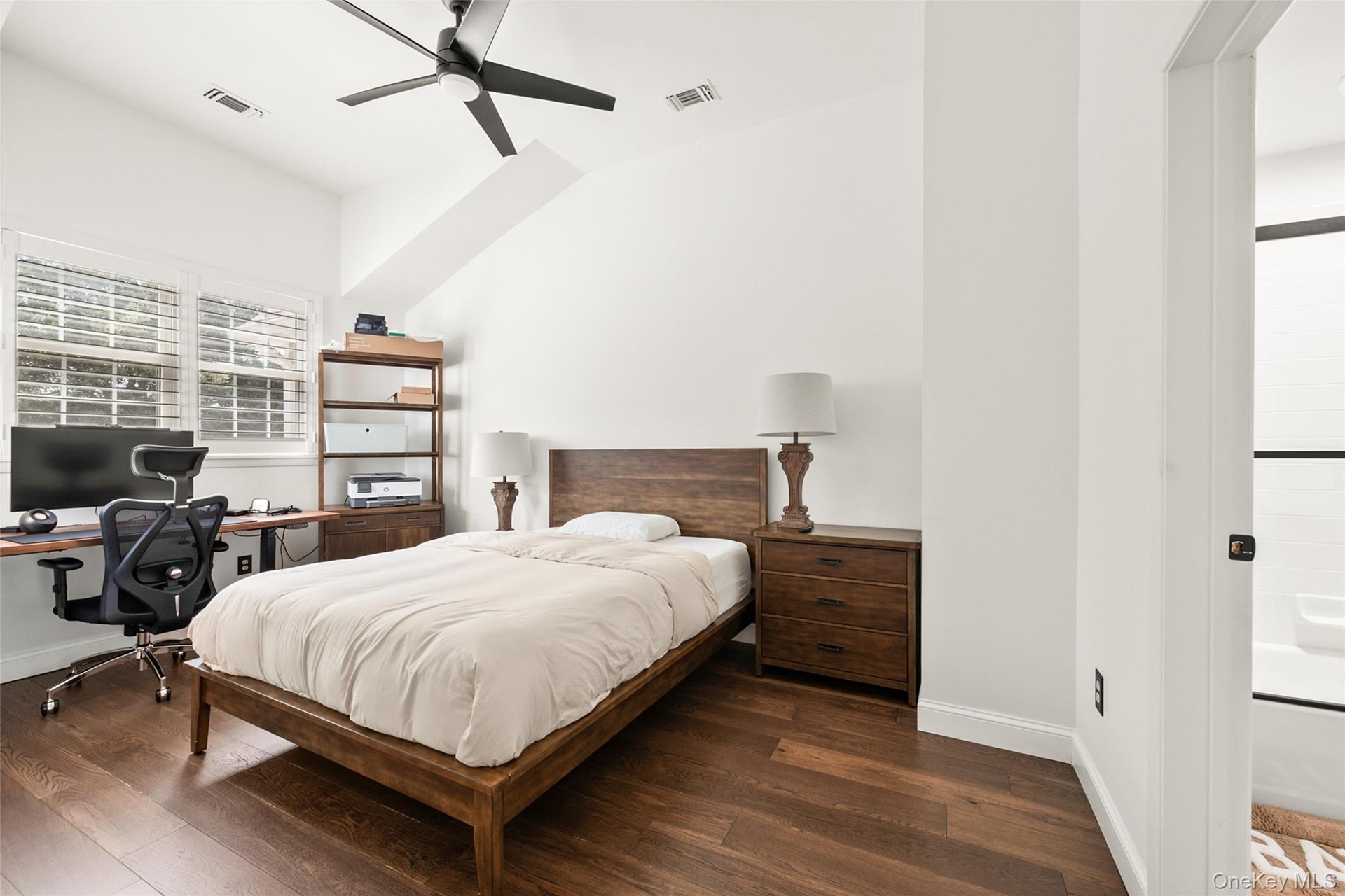 - Bedroom with dark wood-style floors, a ceiling fan, and a desk