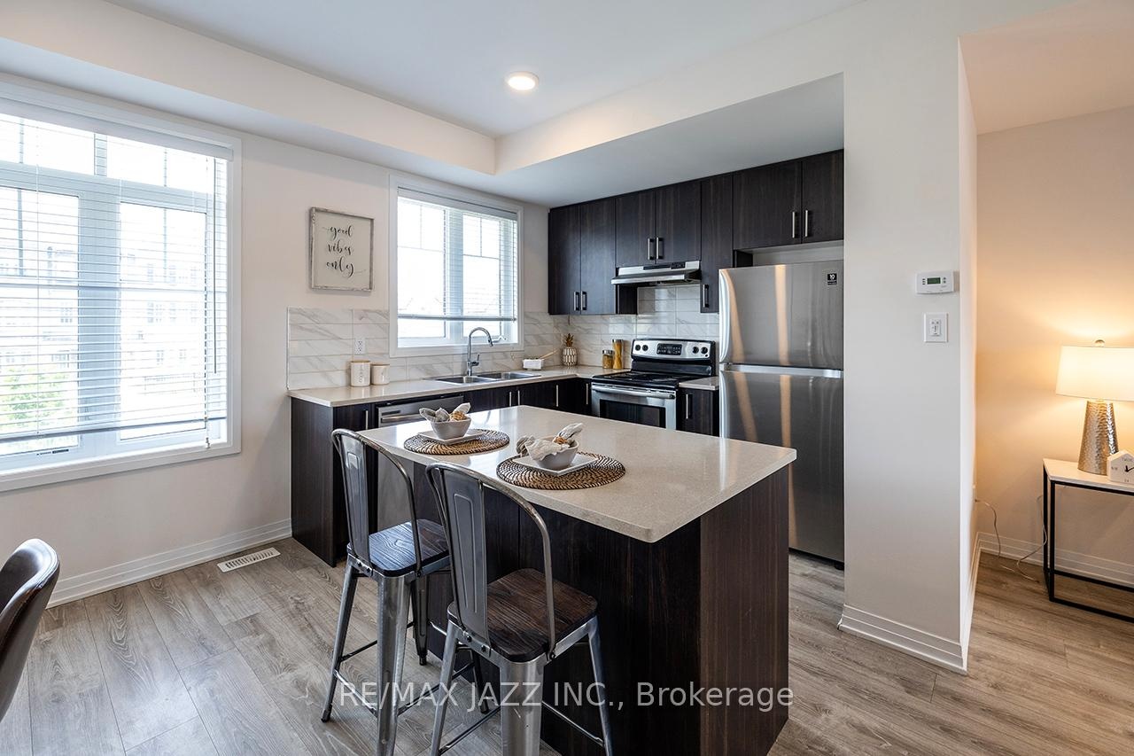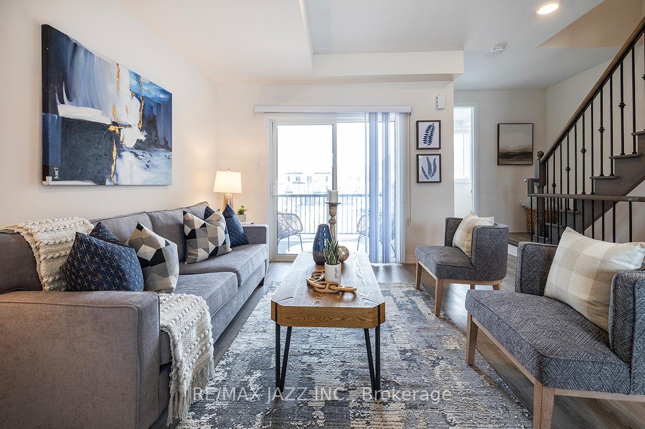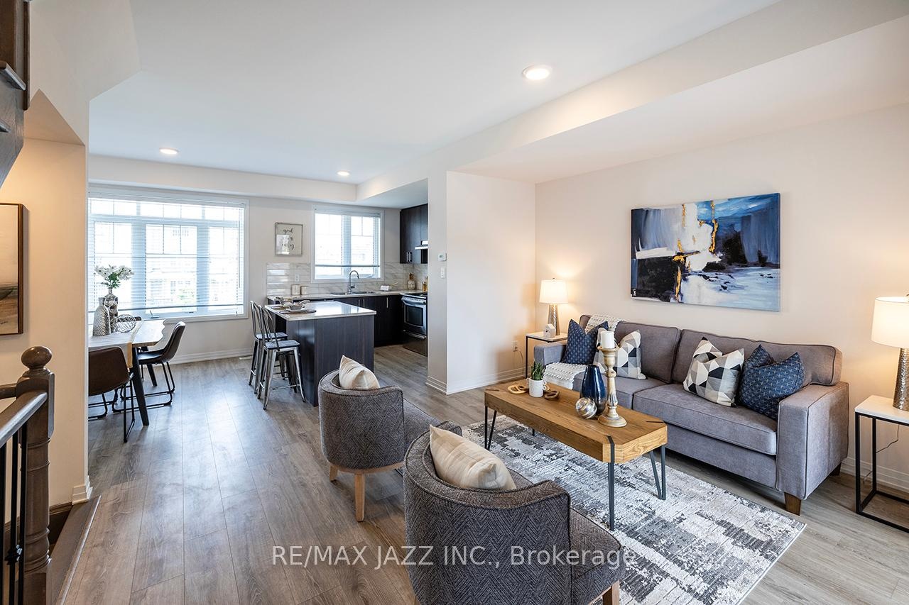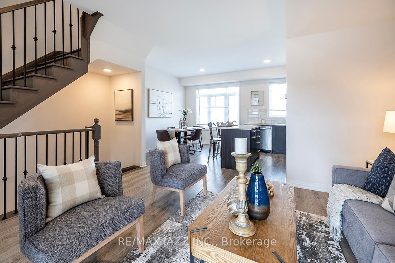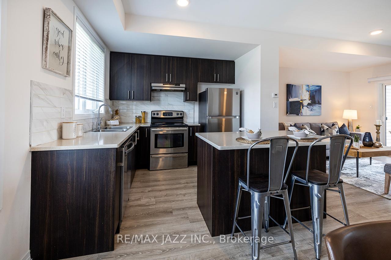 Better than new! The beautifully upgraded "Honeycrisp" model offers 1568 square feet of finished living space. This stunning executive Town-Home is still covered by the Tarion Warranty. It includes 3+1 bedrooms and 4 bathrooms, along with a gorgeous ground floor den/bedroom area that is perfect for a home office or recreation room. This fully upgraded home features laminate flooring throughout, a solid oak staircase with wrought iron spindles, indoor garage access, added convenience of front and rear entrances. The main floor boasts 9-foot ceilings and a lovely open concept design with numerous windows that allow for ample natural light. The large eat-in kitchen is equipped with a center island, quartz countertops, a custom backsplash, and stainless steel appliances. Additional highlights include a spacious covered patio, pot lighting, upgraded window coverings, central air conditioning with a full HRV system, energy-efficient tankless water on demand. This home truly has it all! The upper level contains 3 full bedrooms, with the primary bedroom featuring a full ensuite bath and a walk-in closet. It is simply immaculate and ready for you to move in. Dont hesitate on this one! Its located in an excellent family-friendly area, close to all amenities: schools, parks, shopping, and highways 407/401, among many others. Check out the HD video - its a perfect 10!