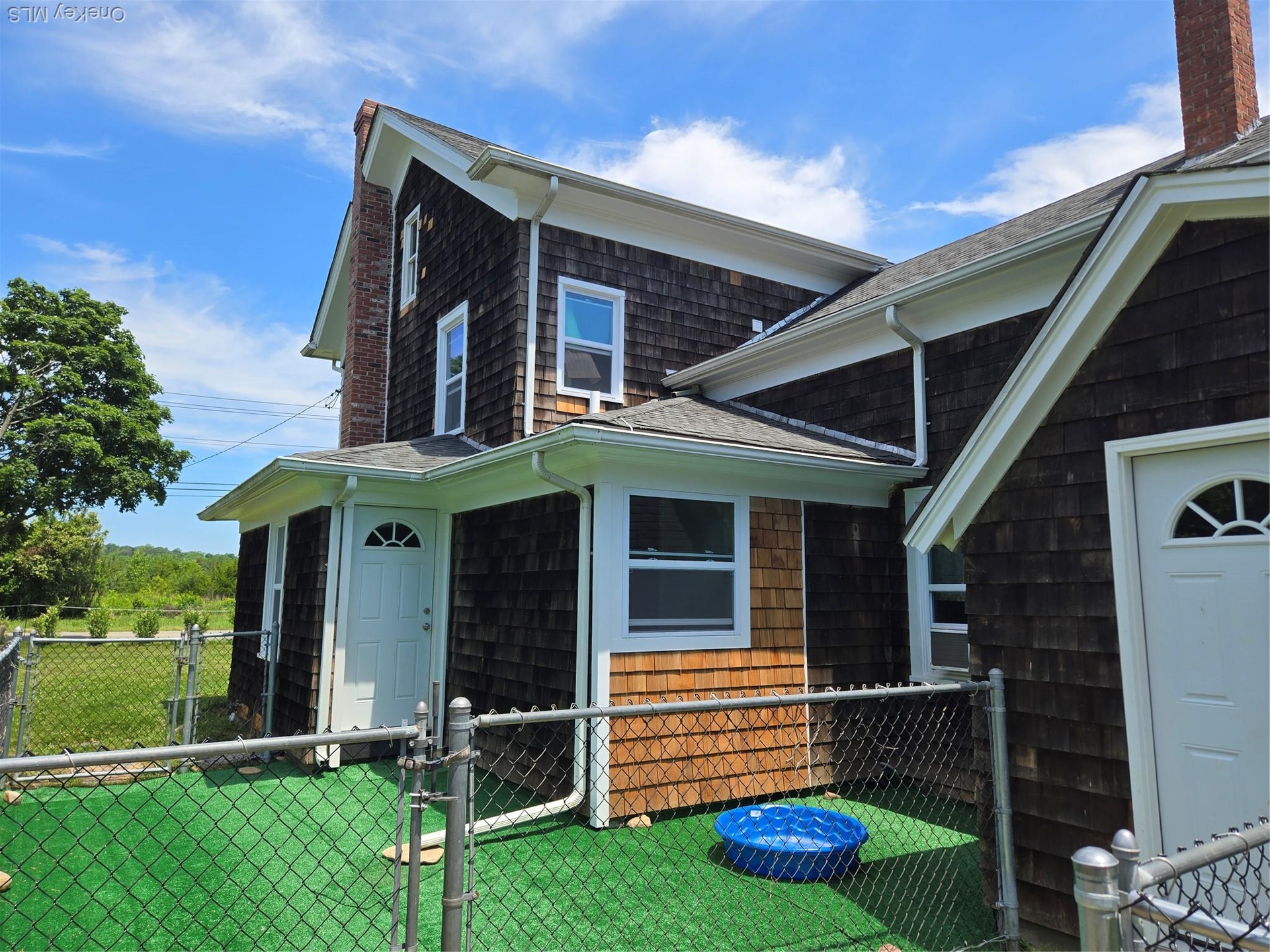- View of side of property featuring a gate, roof with shingles, and a chimney
