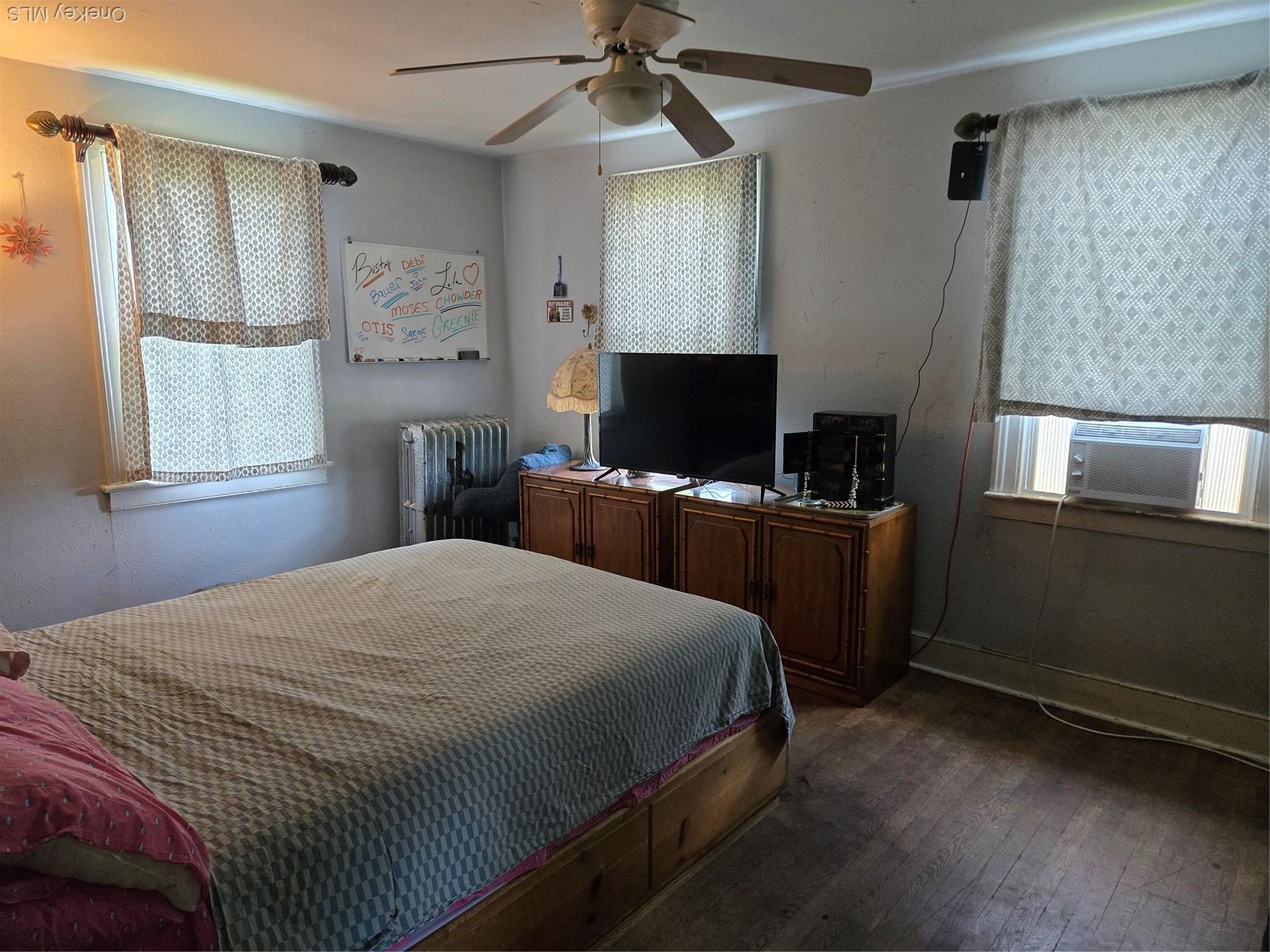 - Bedroom with radiator heating unit, dark wood-style flooring, and ceiling fan