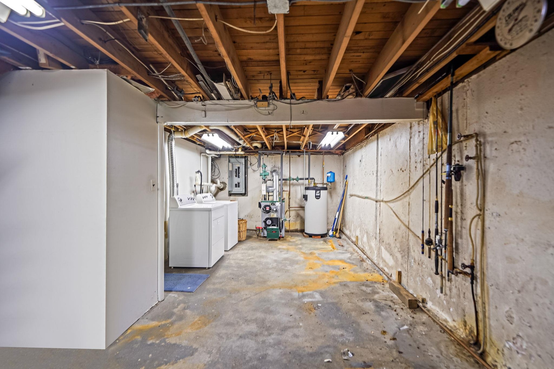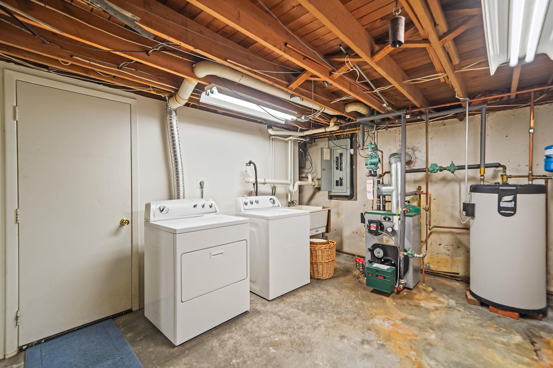 - Unfinished below grade area featuring separate washer and dryer, gas water heater, electric panel, and a heating unit